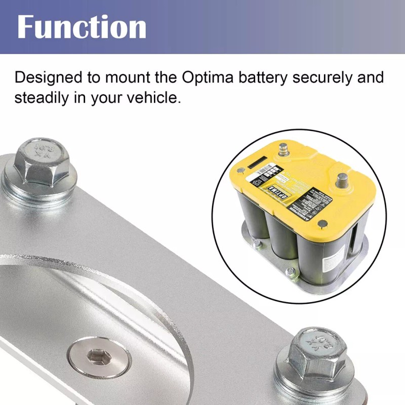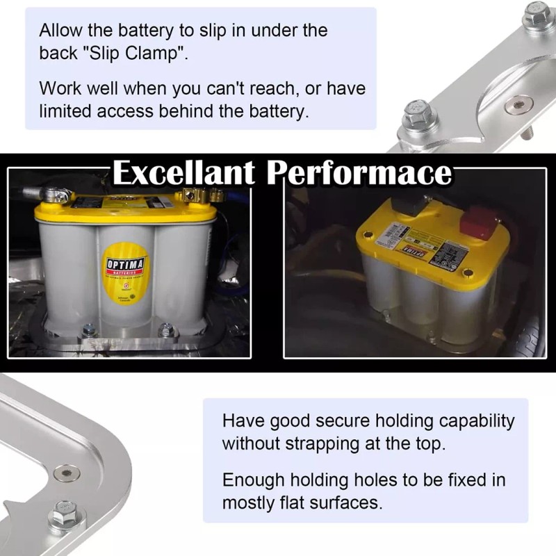 3) Designed to mount the Optima battery securely and steadily. Allow the battery to slip in under the back "Slip Clamp". Work well when you can't reach, or have limited access behind the battery. Enough holding holes to be fixed in mostly flat surfaces. Have good secure holding capability without strapping at the top