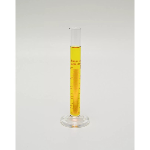 The item listed is a 5mL capacity graduated measuring cylinder made from borosilicate glass. It features an easy-pour spout, graduated metric scales and a round base.