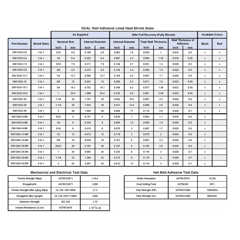 DW1S3X-6.4-BK/RD- Dual Wall (Adhesive Lined) Heat Shrink - 3:1 Shrink Ratio - Nominal Size: 6.4mm - 1/4" - Black or Red