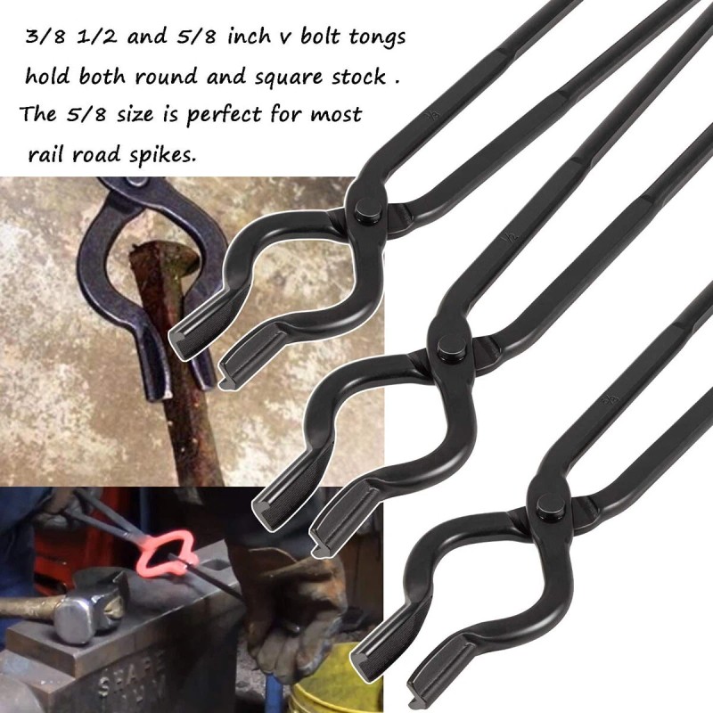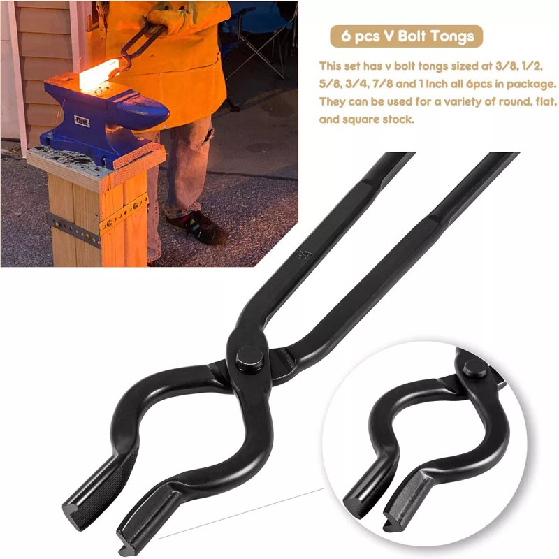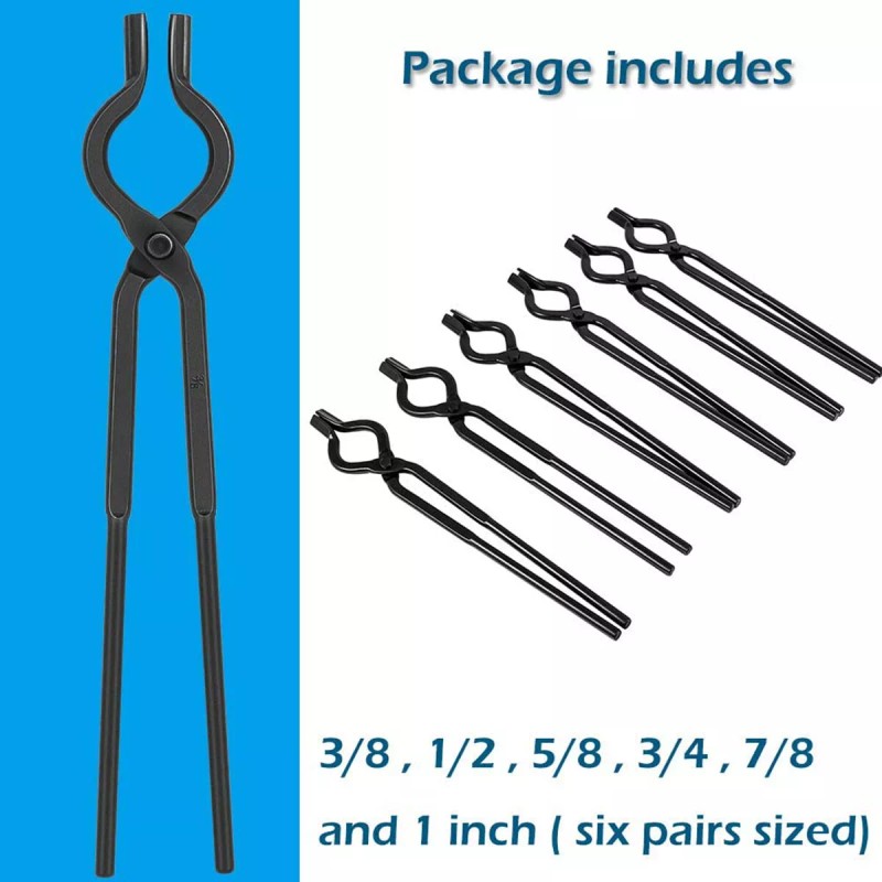 (1) This is an essential and full set of blacksmith tongs, includes six pairs sized at 3/8, 1/2, 5/8, 3/4, 7/8 and 1 inch tongs.