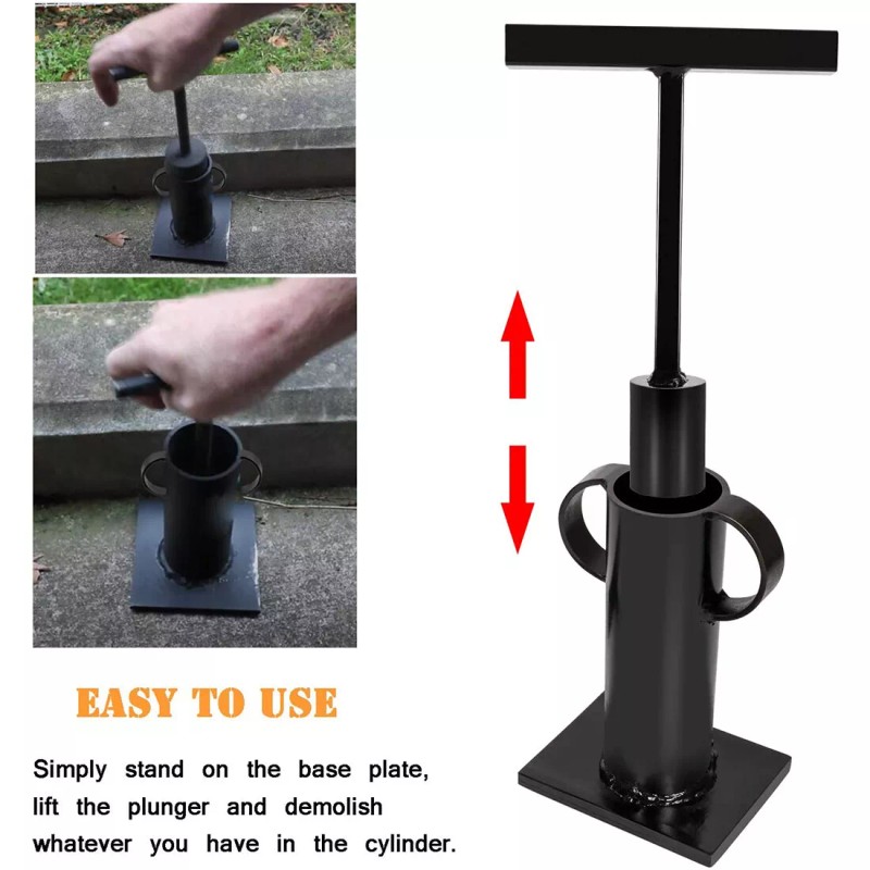 No electric or battery needed. Simply stand on the base plate, lift the plunger and demolish whatever you have in the cylinder.