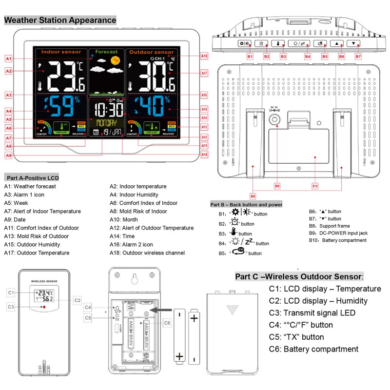Function: Time / Calendar / Temperature / Humidity / Dual Alarm Clock / Snooze / Backlight / RF / Weather forecast / Mold Risk Indicator / Frost Point Alarm