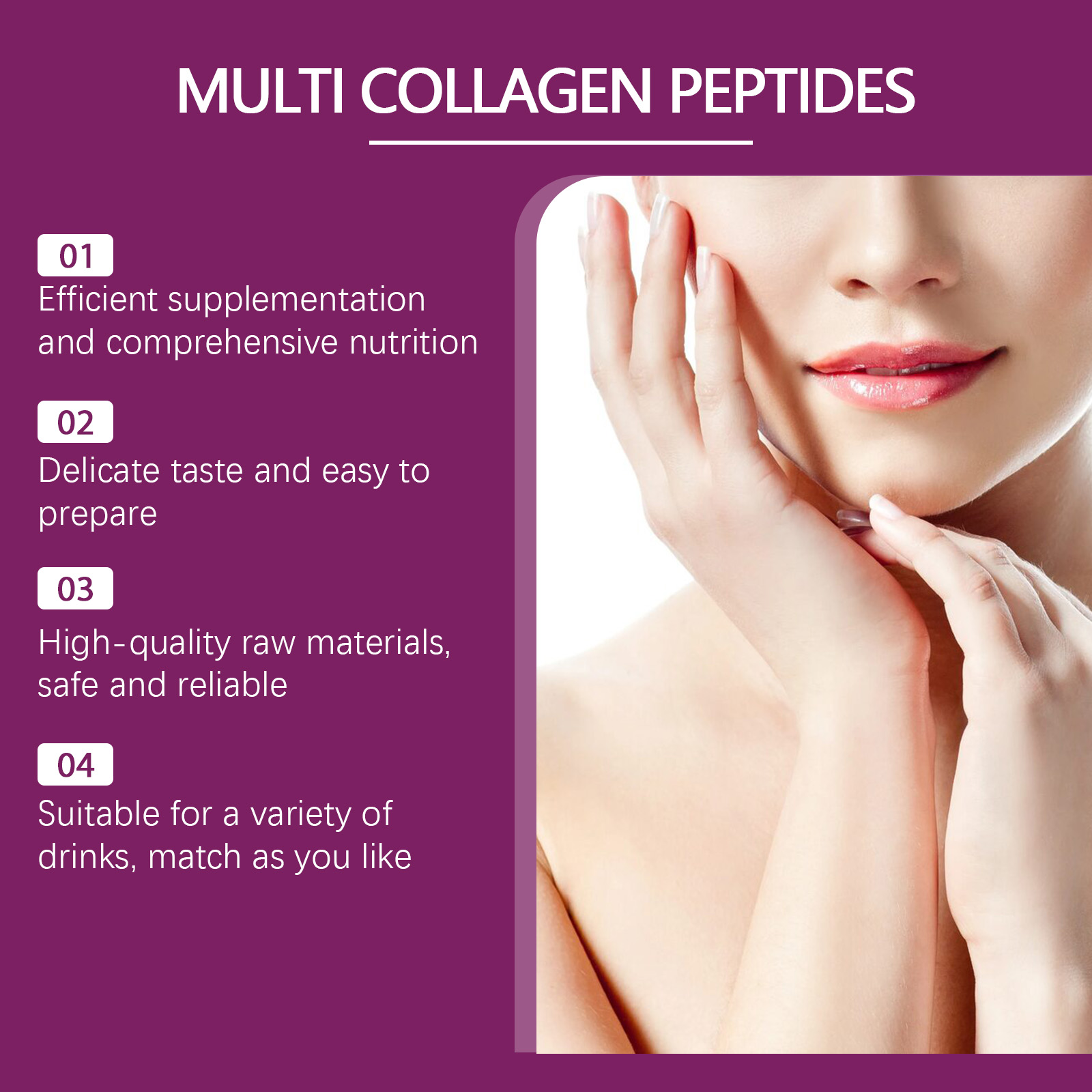 Our multi-collagen powder contains calcium carbonate and maltodextrin. It can be easily mixed into various drinks and is nutritious. Its use method is very simple: prepare the head of about 40℃, take two spoons of this product into the water, stir well and then drink. And can provide rich protein to support daily health needs.
