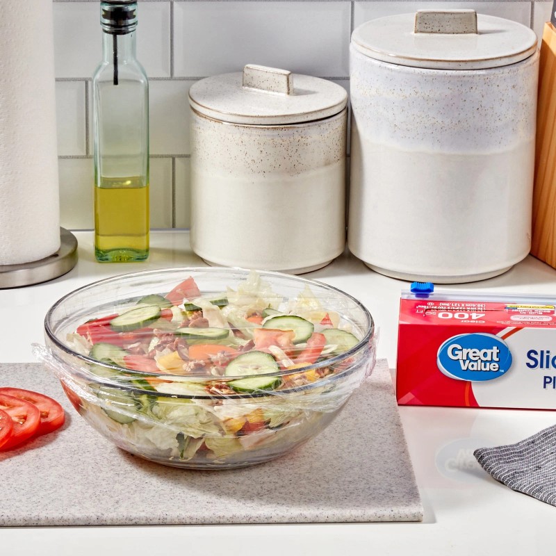 There's never been an easier way to wrap up leftovers than with Great Value Slide Cutter Plastic Wrap. Each package contains a roll of 400 square feet of strong, clear plastic wrap and a slide cutter, eliminating the hassle and mess of tearing off individual sections by hand. This plastic wrap clings tight and seals in freshness, making it great for covering salads and dips to bring to potlucks and tailgates or marinating meats and fish fillets before grilling. Keep your food fresh with Great Value Slide Cutter Plastic Wrap.