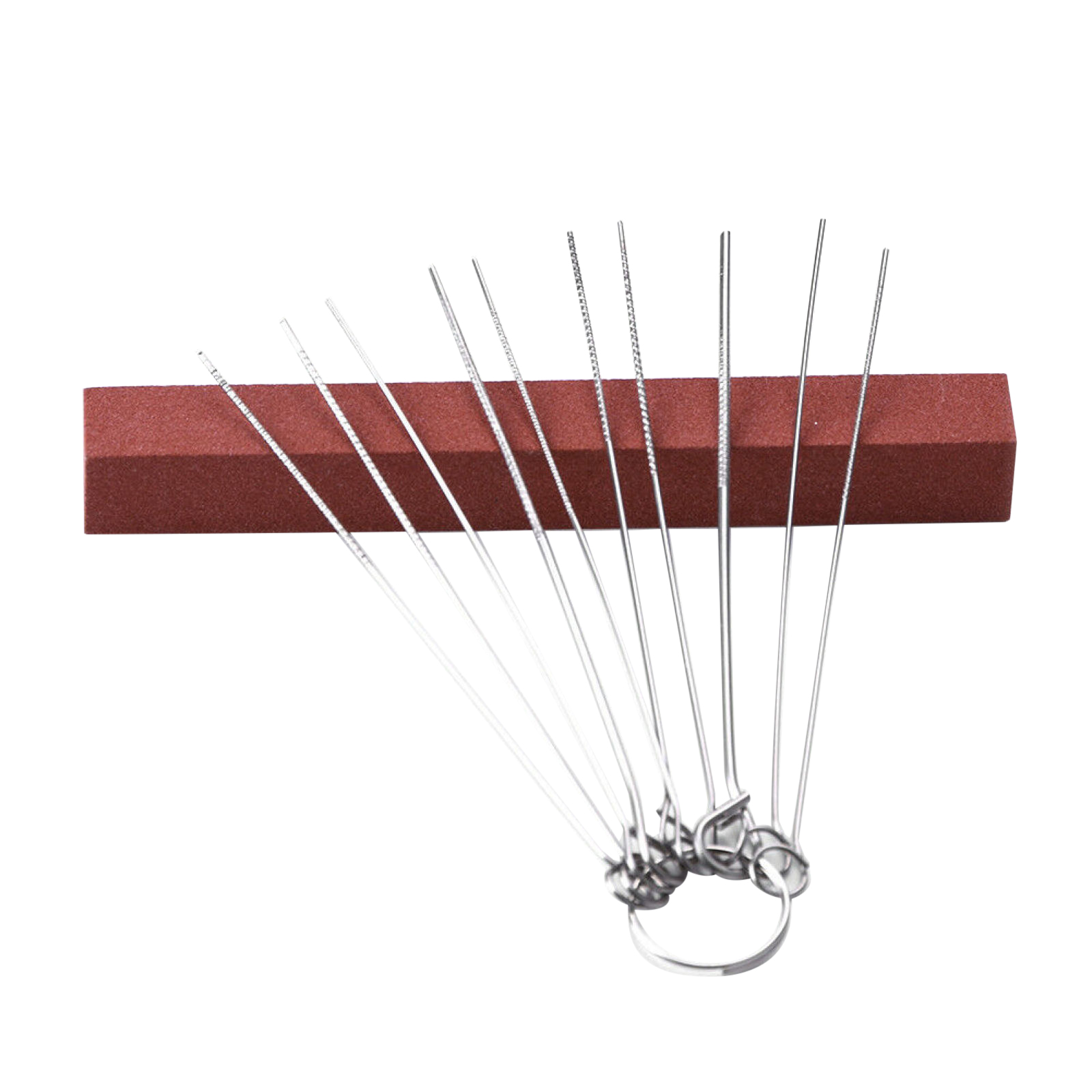 Set of 10 string size 1-10 With the longer shaft length it makes them easier handling for filing string slots.