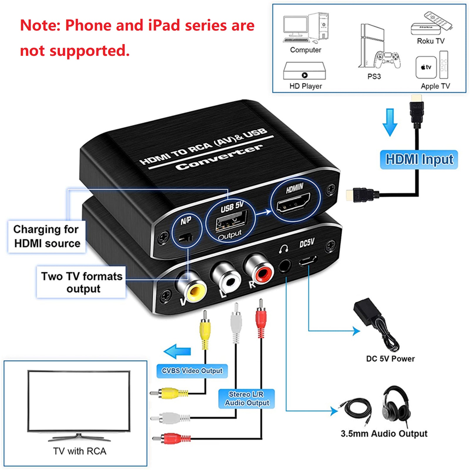 1. HDMI to RCA Converter: HDMI to RCA Converter convert HDMI video signal or audio signal to normal CVBS(AV) Composite video signal(HDMI Input to RCA Output+3.5mm Audio Output),