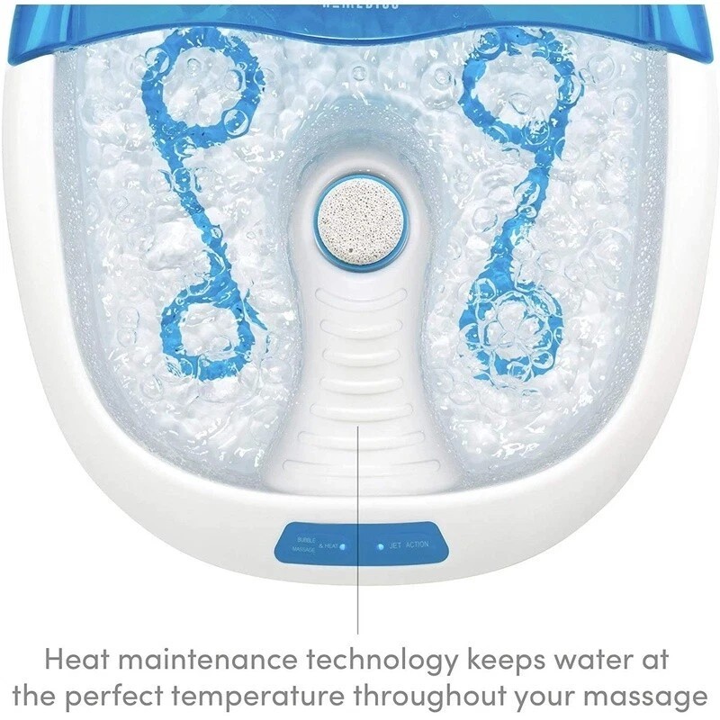 Gentle Massaging Bubbles relax and rejuvenate feet 6 Hydrotherapy Jets for soothing massage Spinning Pedicure Center with 3 attachments and on-board storage –pumice stone, cleansing brush, massage rolled Raised nodes in floor manually massage feet Heat maintenance technology helps maintain the perfect water temperature Super quiet technology for total relaxation Streams of water soothe feet