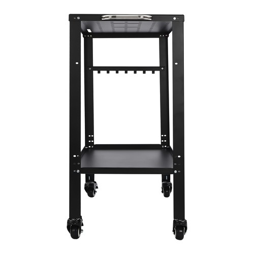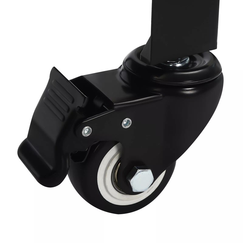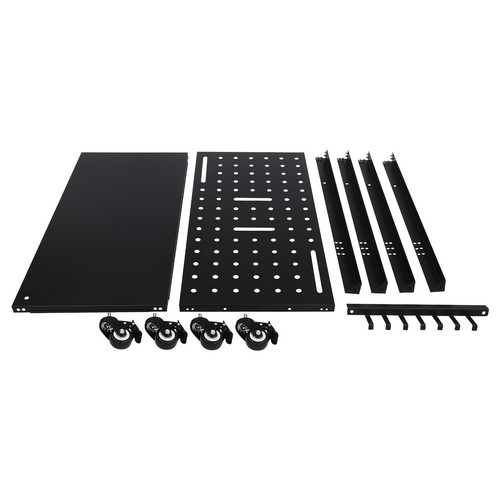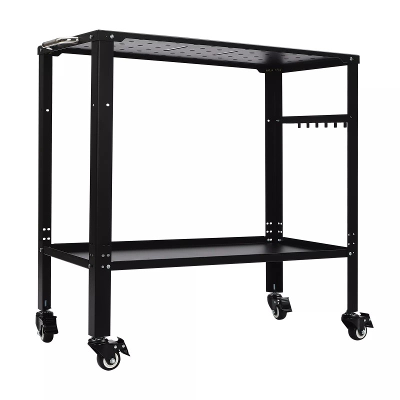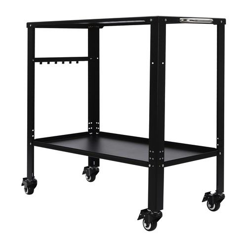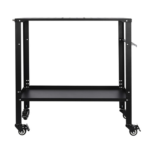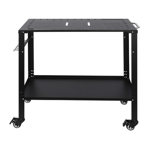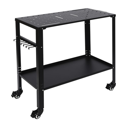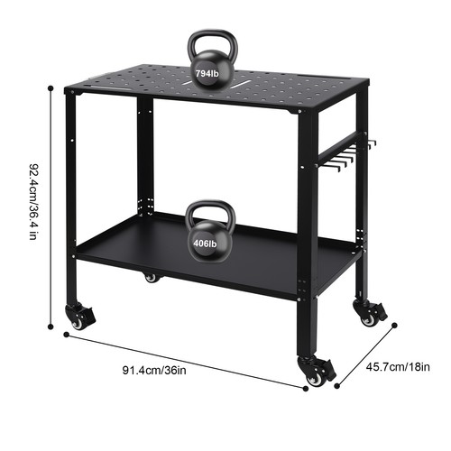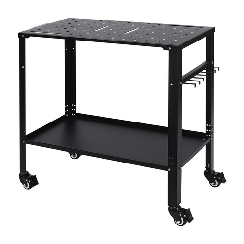 Specifications Material: Steel Surface Treatment: Spray Coating, Baking Paint     Color: Black Style: Modern Shape: Rectangular Mount Type: Freestanding Assembly Required: Yes Base Type: Casters       Number of Tiers: 2 Number of Slots: 4 Number of Wheels: 4 Tabletop Thickness: 3mm/0.12in Tray Edge Height: 25mm/1in Each Hole Diameter: 16mm/ 5/8" Hole Spacing: 60mm/2.4in Adjustable Height of the Tray: 20-30.5cm/8-12in Product Size: 91.5*46*92.5cm/36*18*36-3/8in     Package Size: 94*48*12cm/37*18.9*4.72in Load-bearing Capacity: 544kg/1200lbs Gross Weight: 19.5kg/43lbs Net Weight: 19kg/41.88lbs   Package Included 1* Welding Table 1 Row* Hooks(7pcs) 4* Wheels with Brakes 1* English Manual       All Accessories for Installation