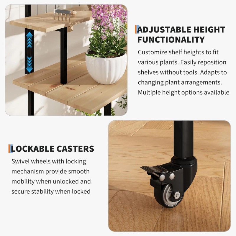 Lockable Caster Wheels for Secure Mobility: Four heavy-duty universal casters enable smooth movement between indoor and outdoor areas like terraces, greenhouses and lounges. Engage wheel locks instantly for stable positioning on uneven surfaces, keeping your plant display securely anchored.
