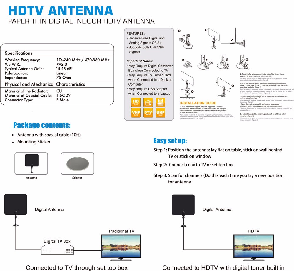 Unbranded INDOOR PAPER THIN FLAT HDTV TV ANTENNA 25 MILES VHF UHF WITH STAND