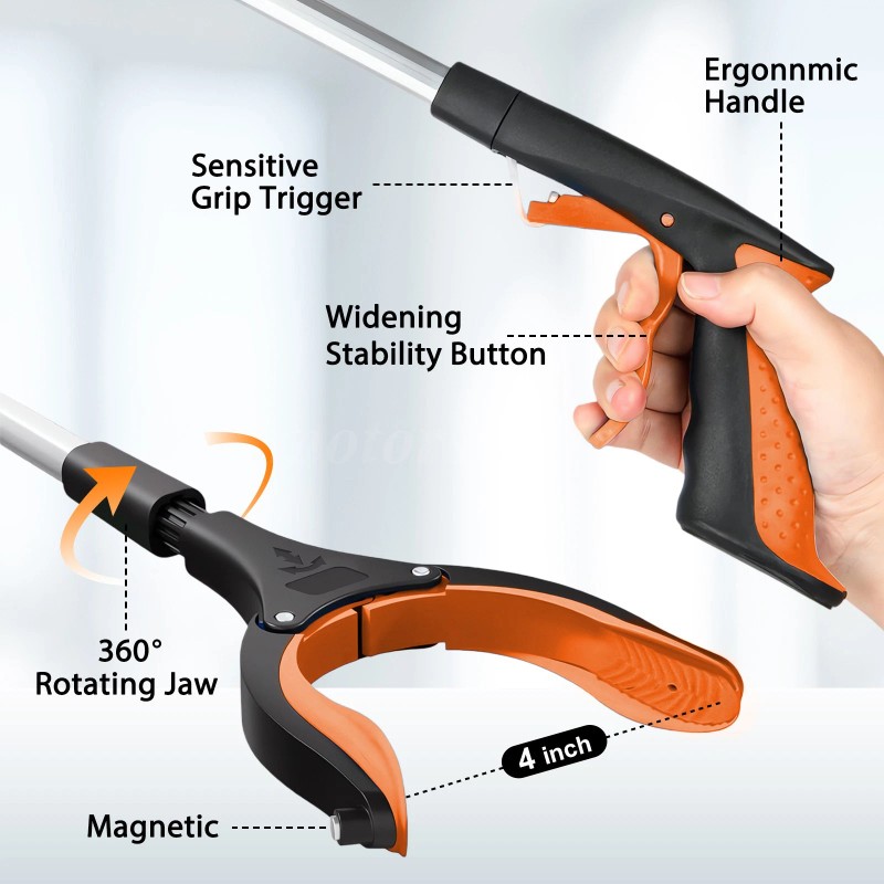 This folding grabber is designed to solve everyday cleaning challenges. Its unique one-touch release function makes picking up lightweight objects like paper, plastic bags, and debris effortless—whether from high, low, or narrow spaces. The foldable design saves storage space, allowing for compact and portable use. The ergonomic handle ensures a comfortable grip, reducing fatigue during prolonged use, making it ideal for seniors, post-surgery patients, and those with limited mobility. The upgraded wide-lock button and 4-inch non-slip rubber jaw provide a secure grip. Perfect for homes, hospitals, parks, and shopping malls, this multi-functional grabber makes cleaning smarter and more efficient!