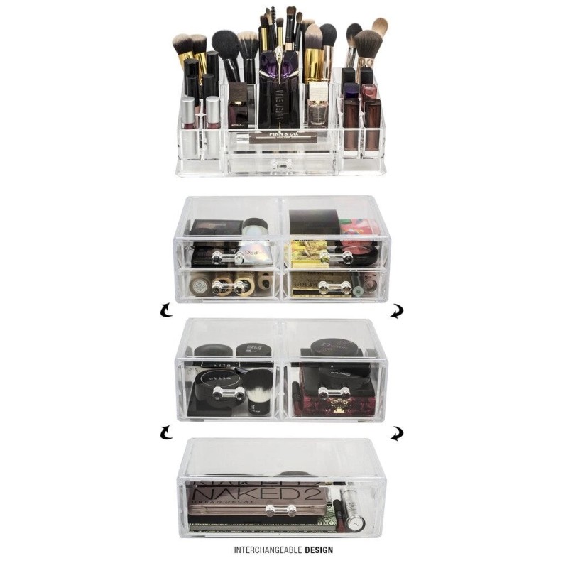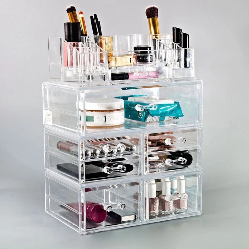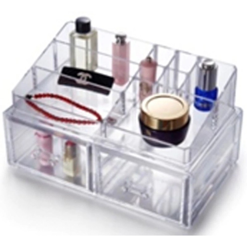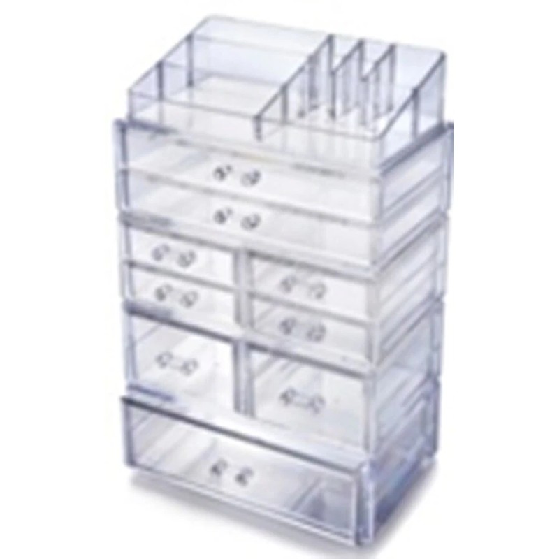 Whether you’re a beauty beginner or glam guru, you now have a place to display your essentials.This spacious clear organizer is a stylish way to define your collection with an effortless view. It features four drawers (both deep and small) in various sizes for cosmetics and nine divided slot compartments on the top tray, perfect for keeping brushes, lipsticks, liners, and more in place. With an interchangeable design, each unit can remain stacked together or used separately to spread out your collection. Don't limit your imagination to beauty needs! Crafts, grooming tools, jewelry, and other personal items can be beautifully organized within this storage case. For convenience, you’ll always see your products right when you need them most while adding a chic display to your vanity. (Makeup NOT INCLUDED).