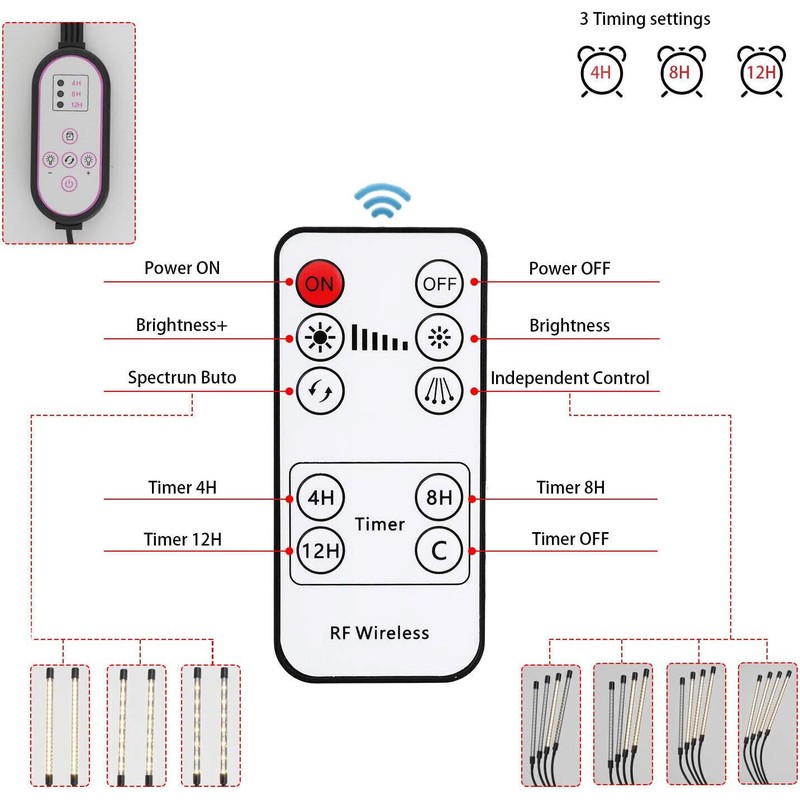 Intelligent Energy Saving: the plant lamp has dual control and multi-function - wire in controller and RF controller (which can protect your eyes from looking directly at the lamp). It supports 3 kinds of lighting modes, 10 kinds of dimmable levels, 4 kinds of lighting independent control, and automatically turns on / off every day after setting 4H / 8h / 12h timer. Each function is compatible. Equivalent to 100W HPS lamp.