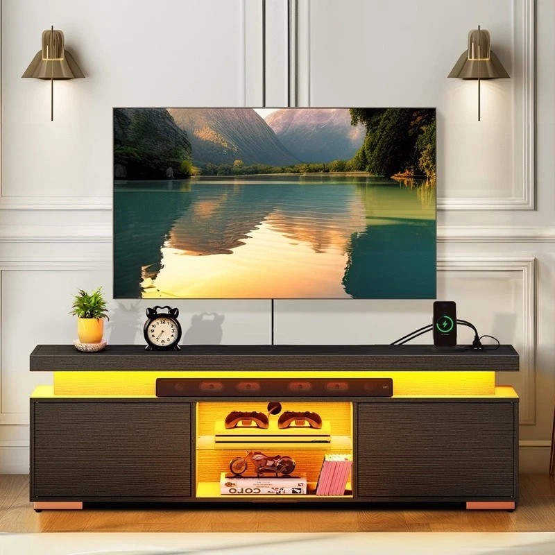 The entertainment center TV stand features 16 color options and 4 flashing modes that can be controlled wirelessly. You can also customize colors using the app, creating a lively atmosphere for movies, gaming, or holiday celebrations.