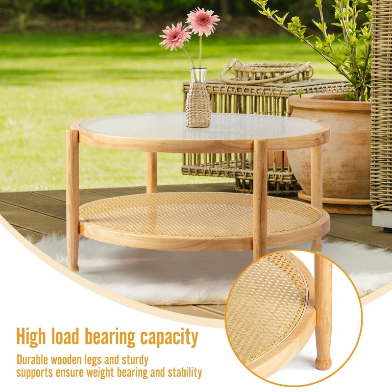 Unbranded Light Wood Boho Round Rattan Coffee Table w/ Glass Top for Indoor or Outdoor