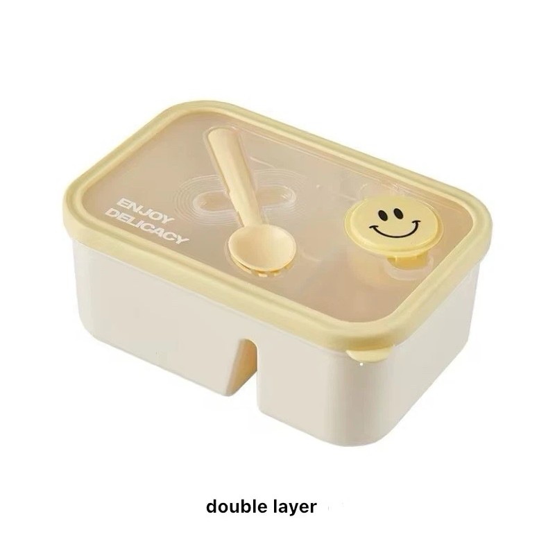 Lot of 3 new yellow bento boxes with salad dressing containers and spoon & fork. The lot contains one single layer bento box which has two internal compartments as well as the sauce container on top. Its dimensions are 8.07” long by 5.59” wide by 2.56” deep. This holds up to 4 cups of food. The lot includes two double layer bento boxes with sauce container. The double layer has 4 internal compartments as well as the sauce container. It holds over 5 cups of food. The double bento box measures 8.07” long by 5.59” wide by 3.35” deep. These are all new. Microwave and dishwasher safe. BPA free. They come from non-smoking home.