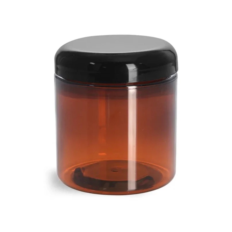 Unbranded Lot of 48 - 8 oz Amber Plastic Jars with Black Domed Lined Lids