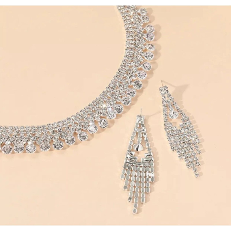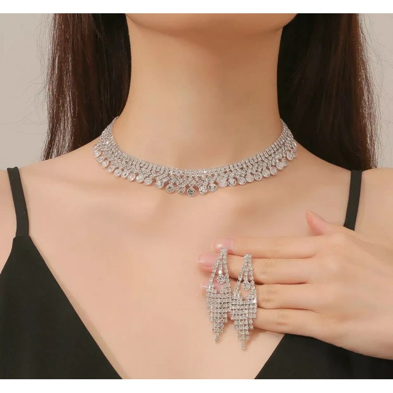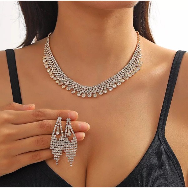 Unbranded Luxurious Full Diamond Collar Bone Necklace Earrings Set Gold or silver