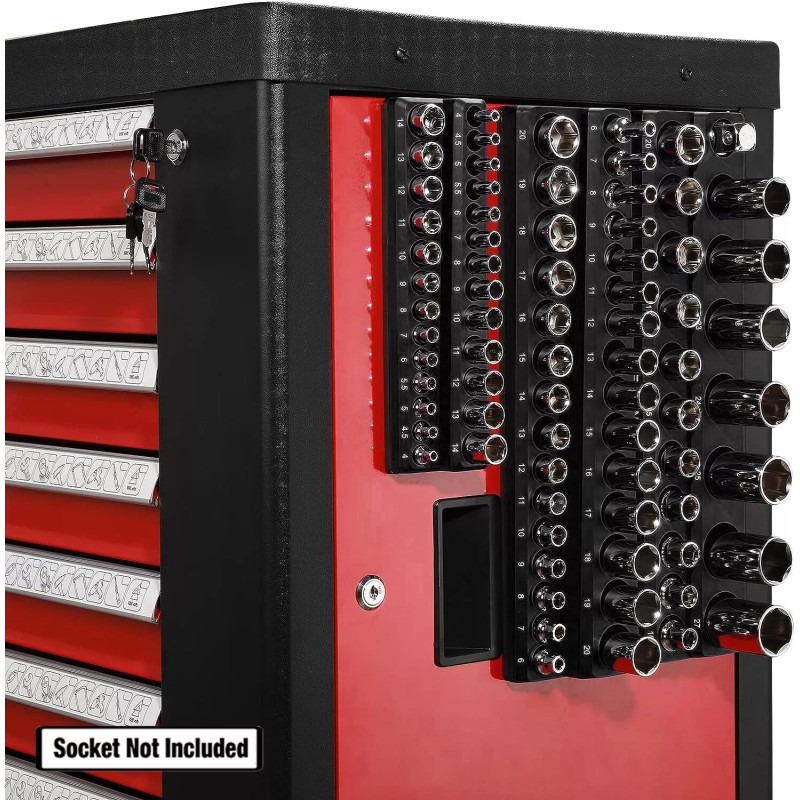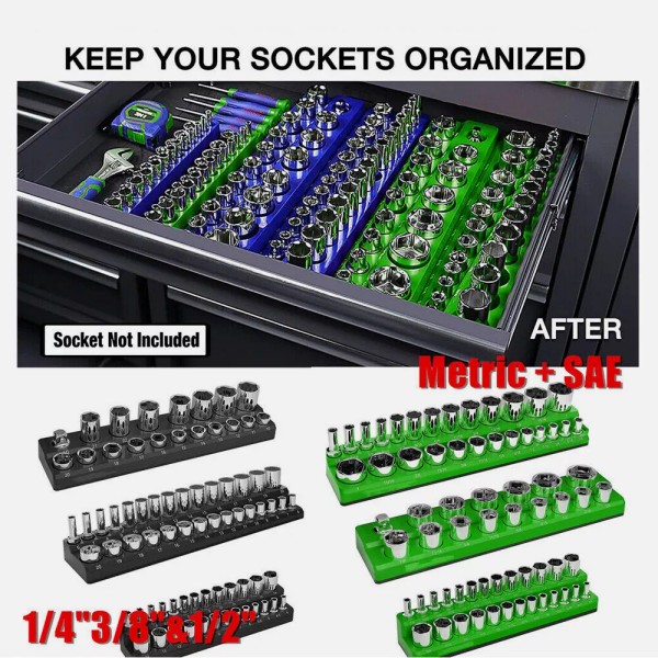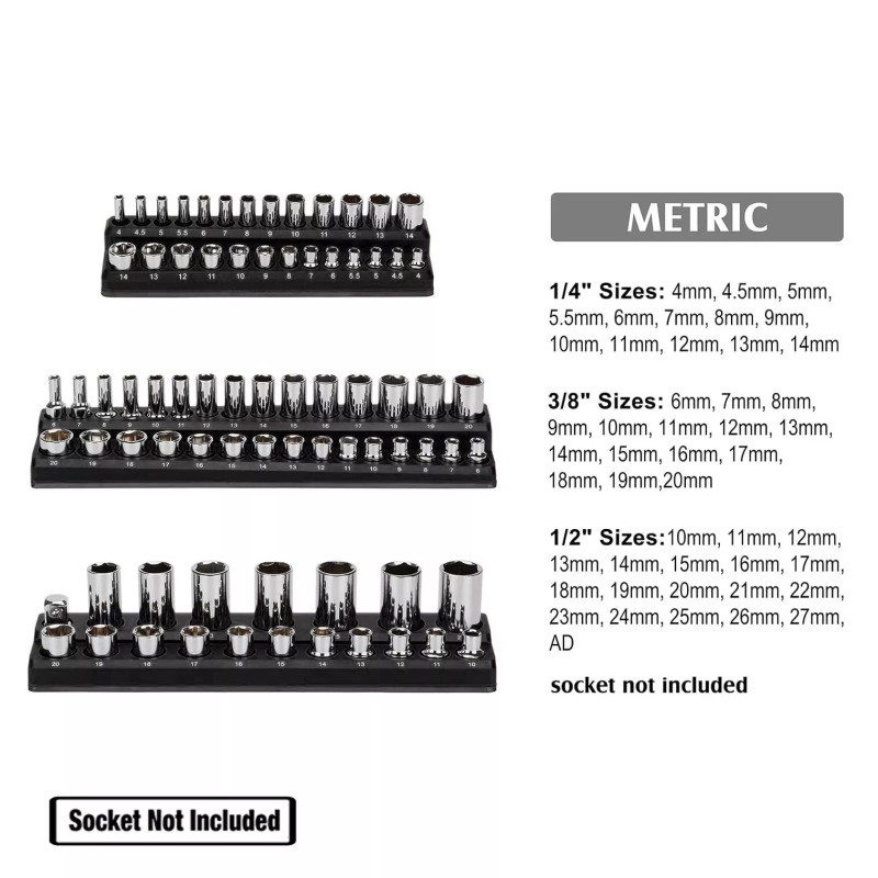 Large Capacity Magnetic Socket Organizer Set: These magnetic socket organizers can store up to 75 metric sockets. The kit includes three black metric magnetic socket organizers for 1/4", 3/8" and 1/2" drives. They collect metric receptacles but not for impact sockets. Tip: sockets are not included with the holders.