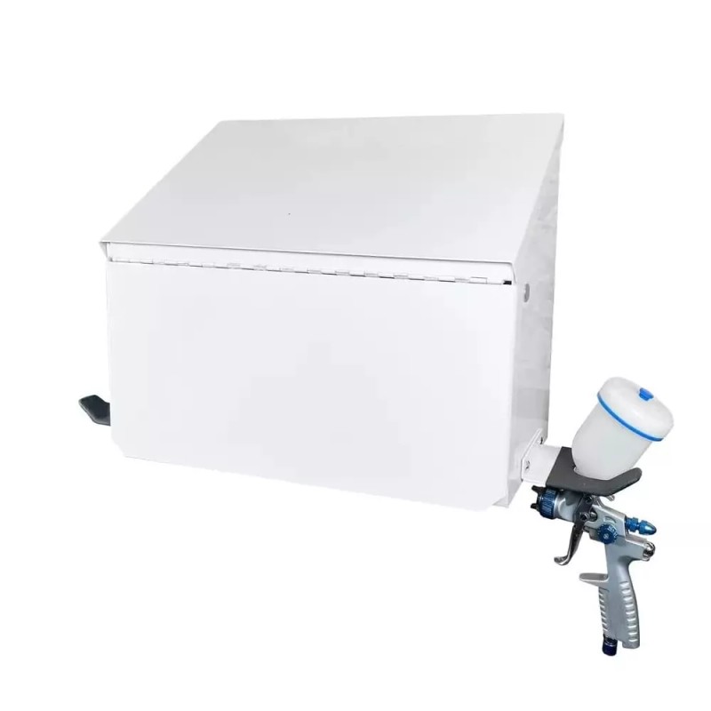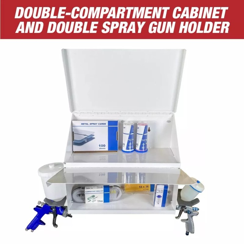 This Magnetic Spray Booth Box is a double-compartment cabinet and double spray gun holder with two mounting options: magnetic or mounting fasteners both options allow for airflow passage in the rear of the cabinet thus reducing overspray pocketing.