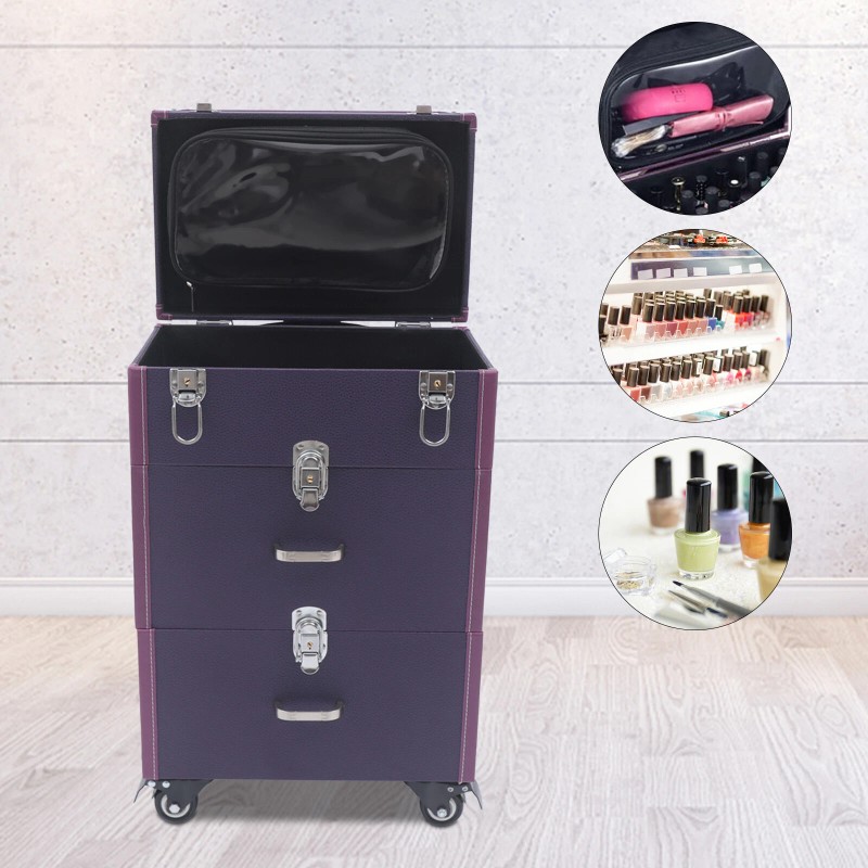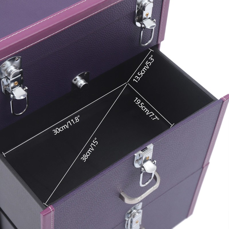 Specification Material: PU+PVC+Zinc Alloy Color: Purple Maximum Length of Telescopic Rod: 45cm/17.8'' Number of Layers: 3 Shape: Cuboid Wheel Height: 7cm/2.8'' Lid Height: 5cm/2inch Upper Layer Size: 36*23*9cm/14.2*9*3.5inch Middle Layer Size: 36*23*17cm/14.2*9*6.7inch Bottom Layer Size: 36*23*17cm/14.2*9*6.7inch Upper Layer Inside Size: 33.5*22*8cm/13.2*8.7*3inch Each Upper Compartment Size: 3.5*3.5*4.5cm/1.4*1.4*1.8inch Diagonal Length of Upper Layer: 40cm/15.7inch Middle Layer Inside Size: 30*19.5*13.5cm/11.8*7.7*5.3inch Diagonal Length of Middle Layer: 38cm/15inch Each Bottom Layer Compartment Size: 14.5*19*13.5cm/5.7*7.5*5.3inch Diagonal Length of Each Bottom Compartment: 22cm/8.7inch Package Size: 63*32*41cm/24.8*12.6*16.14'' Product Size: 36*23*49cm/14.2*9*19.29'' Gross Weight: 10kg/22lbs