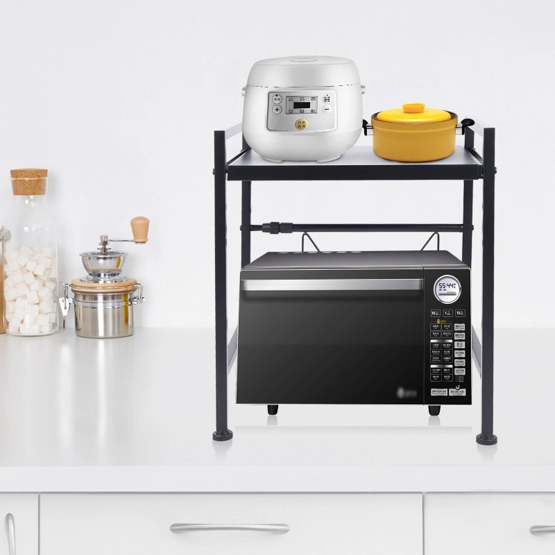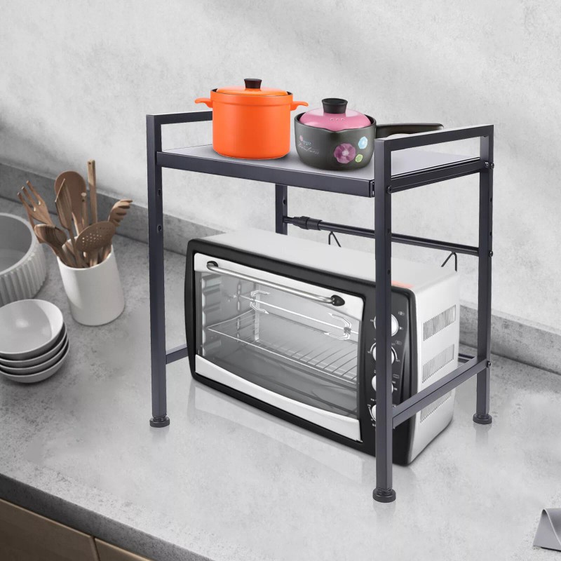 Multifunctional storage rack, not only as microwave shelves, but also as a spice rack. Different types of kitchen supplies can be placed on the top level and hung on the side hooks, and microwaves and ovens can be placed on the bottom level.