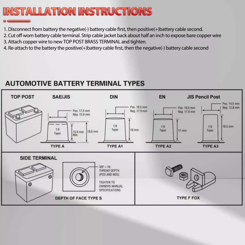 POSITIVE AND NEGATIVE TERMINAL- These battery terminal connectors are sized and marked properly for the positive and negative terminal (17.5mm-19mm tapered positive, 15.9mm-17mm tapered negative).