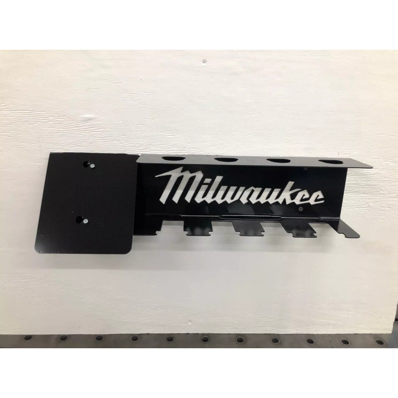 New custom-made battery and charger holder for Milwaukee M12 and M18 batteries. CNC plasma cut out of heavy 14-gauge steel and painted black. See other items for sale for different configurations.