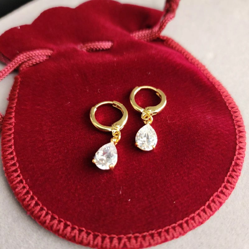 Add the perfect touch of elegance to your outfit with these stunning 24K gold plated pear cut CZ dangle earrings. The timeless design features a sparkling cubic zirconia stone that catches the light beautifully. The earrings come in a classic gold color and are perfect for any occasion.