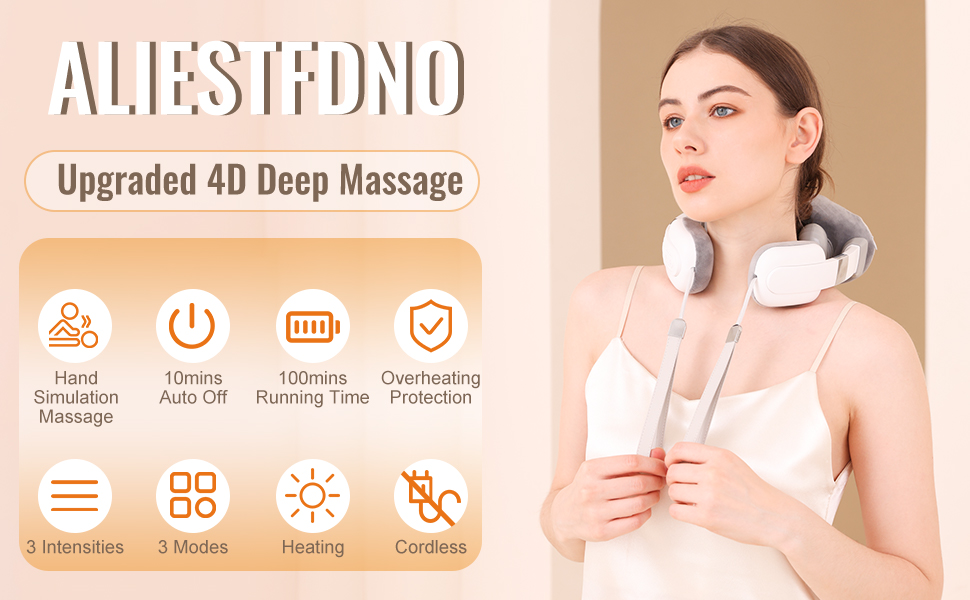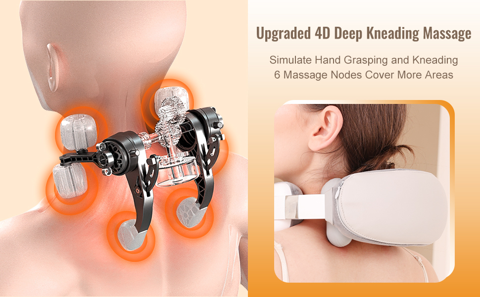 1. 4D Kneading Massage: This neck massager adopts upgraded 4D kneading technology, which simulates hand grasping and kneading, with 6 massage nodes to cover a wider massage area.