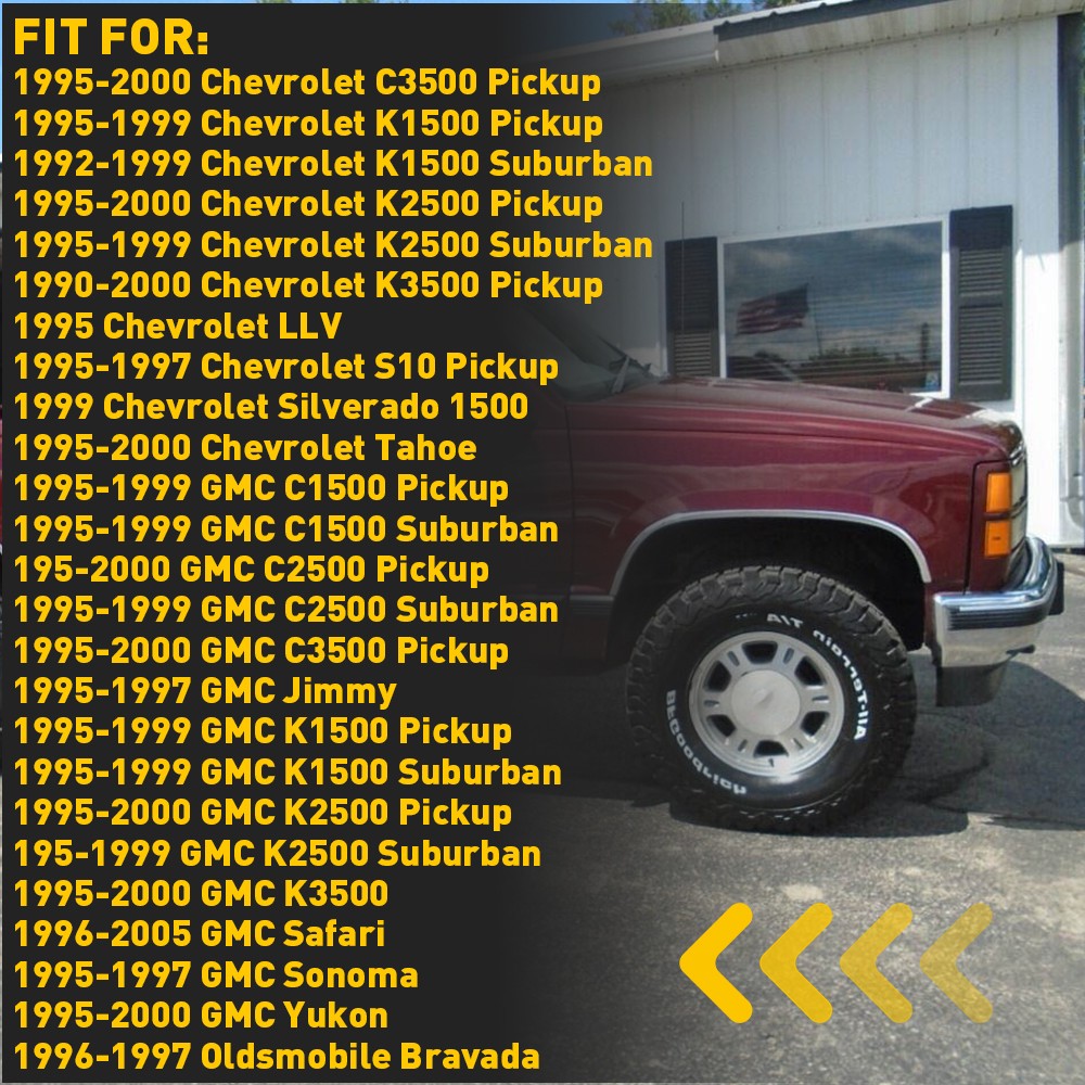 Fit for: 1999-2000 Cadillac Escalade 1996-2005 Chevrolet Astro 1995-1997 Chevrolet Blazer 1995-1999 Chevrolet C1500 Pickup 1995-1999 Chevrolet C1500 Suburban 1995-2000 Chevrolet C2500 Pickup 1995-1999 Chevrolet C2500 Suburban 1995-2000 Chevrolet C3500 Pickup 1995-1999 Chevrolet K1500 Pickup 1992-1999 Chevrolet K1500 Suburban 1995-2000 Chevrolet K2500 Pickup 1995-1999 Chevrolet K2500 Suburban 1990-2000 Chevrolet K3500 Pickup 1995 Chevrolet LLV 1995-1997 Chevrolet S10 Pickup 1999 Chevrolet Silverado 1500 1995-2000 Chevrolet Tahoe 1995-1999 GMC C1500 Pickup 1995-1999 GMC C1500 Suburban 1995-2000 GMC C2500 Pickup 1995-1999 GMC C2500 Suburban 1995-2000 GMC C3500 Pickup 1995-1997 GMC Jimmy 1995-1999 GMC K1500 Pickup 1995-1999 GMC K1500 Suburban 1995-2000 GMC K2500 Pickup 1995-1999 GMC K2500 Suburban 1995-2000 GMC K3500 1996-2005 GMC Safari 1995-1997 GMC Sonoma 1995-2000 GMC Yukon 1996-1997 Oldsmobile Bravada