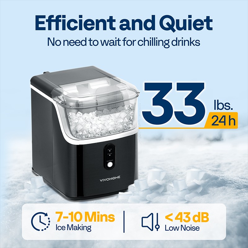 EFFICIENT AND QUIET: This ice maker is designed to offer fast and ample supply of fresh nugget ice, and you can get a batch of soft and crunchy ice within 7 to 10 minutes; With a generous 1.1 L water tank, it can generate approximately 33 lb pebble ice within a 24-hour period; The powerful built-in compressor and silent exhaust fan provide exceptional cooling performance and operate at a low noise level