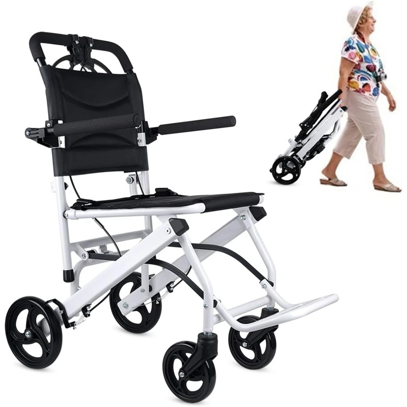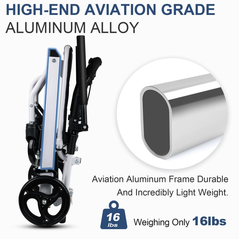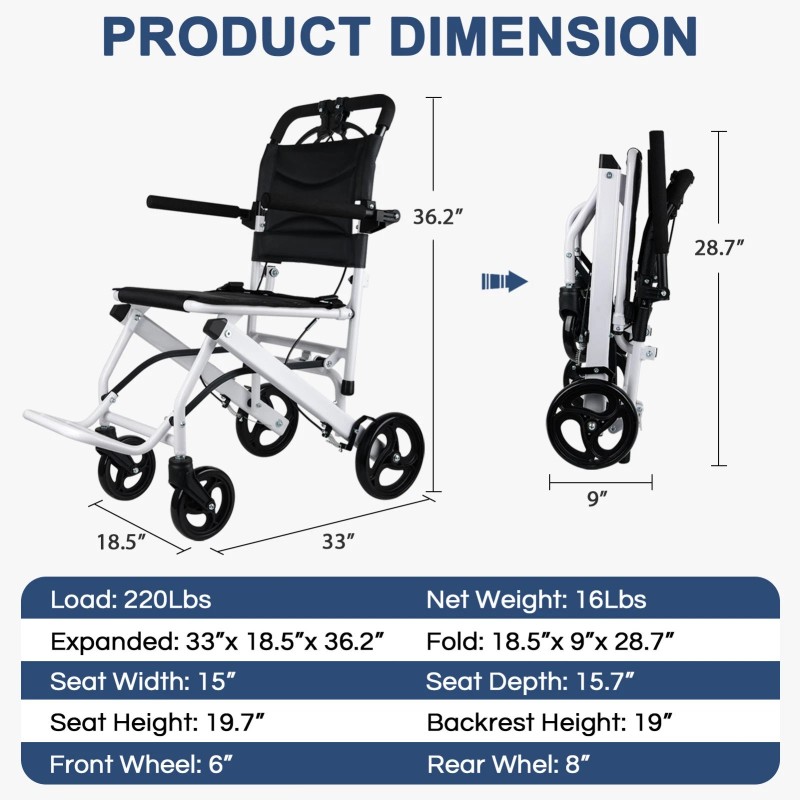 - The wheelchair weighs only 16lbs, one of the lightest wheelchairs with a weight capacity of 220lbs, no assembly required, just open and lock it to start using.