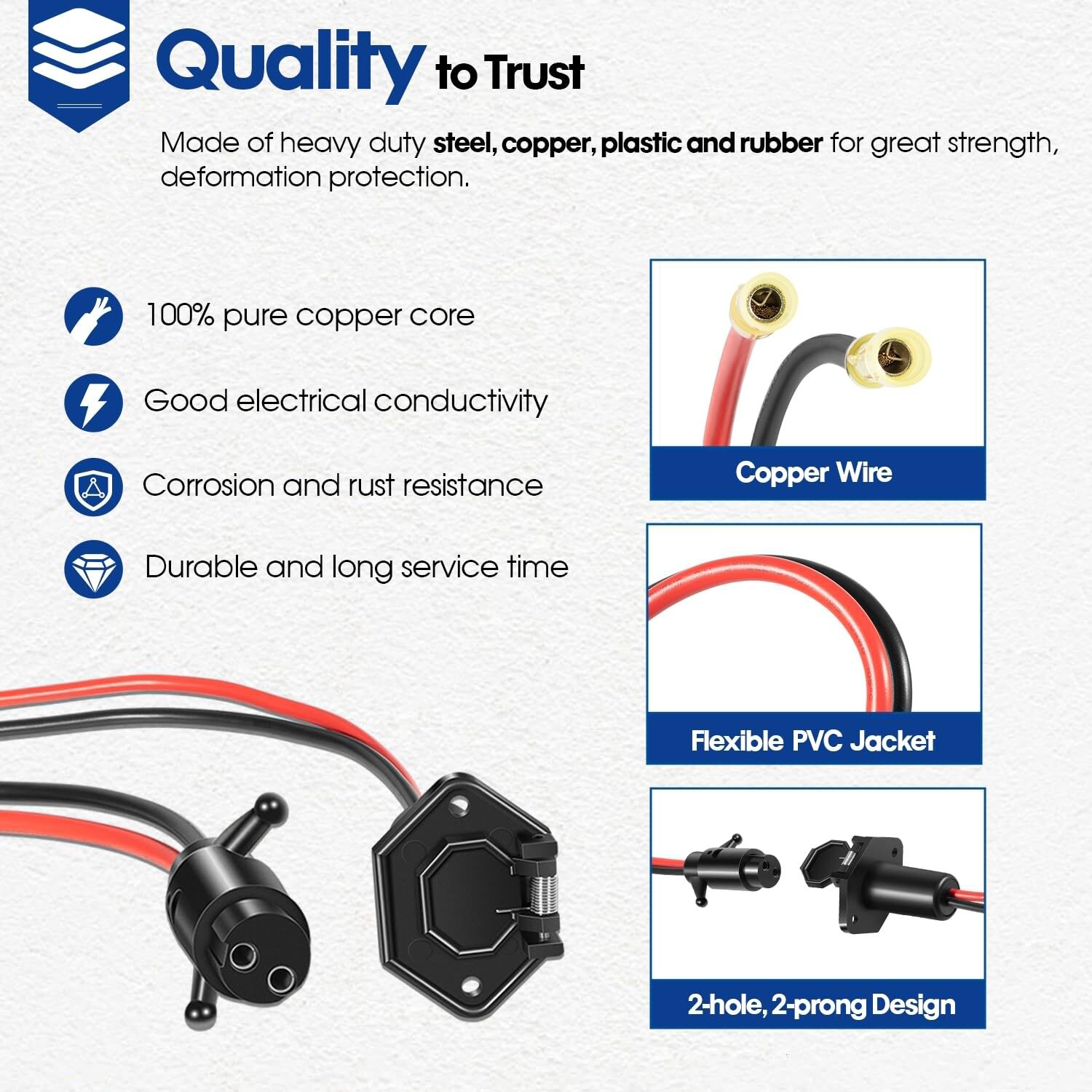 【Engineered to High Standards】: Come with 1 male plug trolling motor connector, 1 female receptacle with waterproof cover, 4 butt connectors. 2 holes, 2-prong design, performs in 8 gauge wire leads, 12 volt. Copper-plated wire reduces resistance, built to last, improved performance andquicker power delivery.