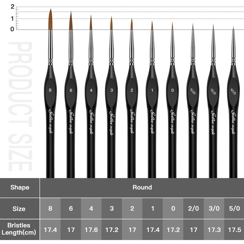 Our detail paint brush set includes 10 meticulously crafted miniature brushes in various sizes (5/0, 3/0, 2/0, 0, 1, 2, 3, 4, 6, 8), ensuring you always have the perfect tool for every step of your artistic projects. Whether you're working on nail art, face painting, miniatures, models, figurines, or rocks, this set is designed to meet all your detailing needs.