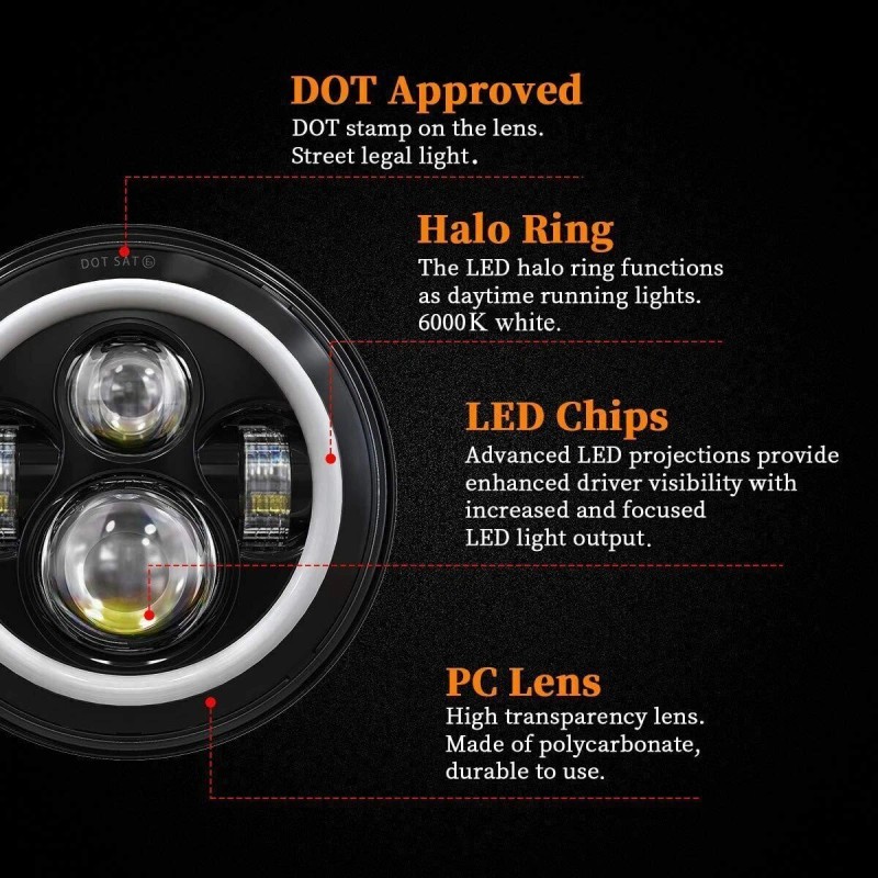 - Features: DOT-Certified, Halo Headlights, Factory Headlights, SAE-Certified