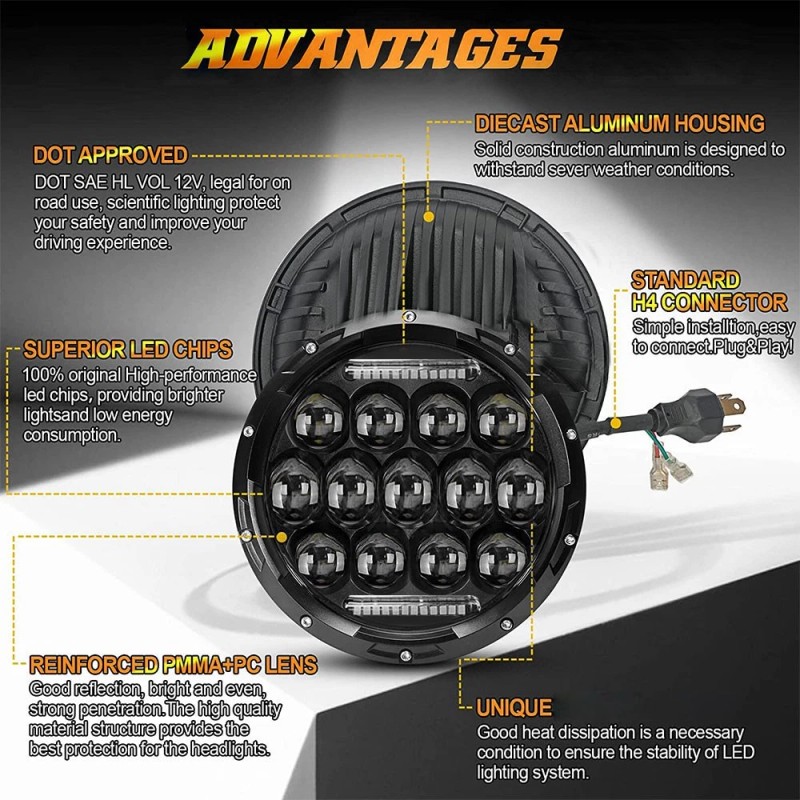 - Items Included: 2x 7 inch LED Headlights, 2x H4 to H13 Adapter