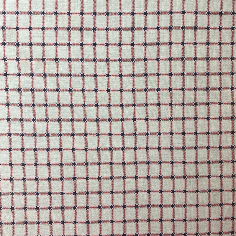 This is a check/plaid fabric with red stripes and small blue stars. This fabric has a light drape and would be great for apparel in addition to quilts or crafts. It has an American patriotic style to it.