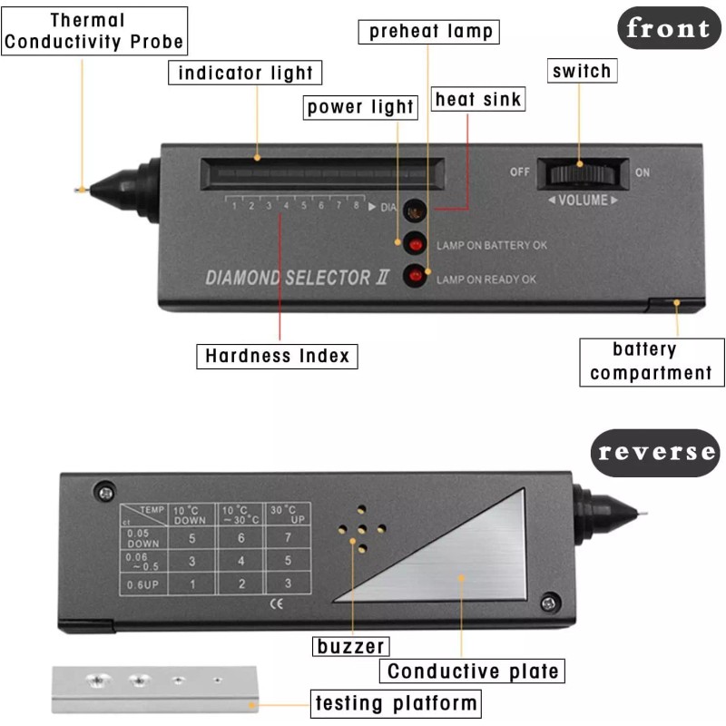 - Material: The diamond detection pen is constructed of high quality plastic and comes with its own leather case packaging. Small enough to fit in any backpack. Simple and precise operation, powered by a DC 9V battery (included).