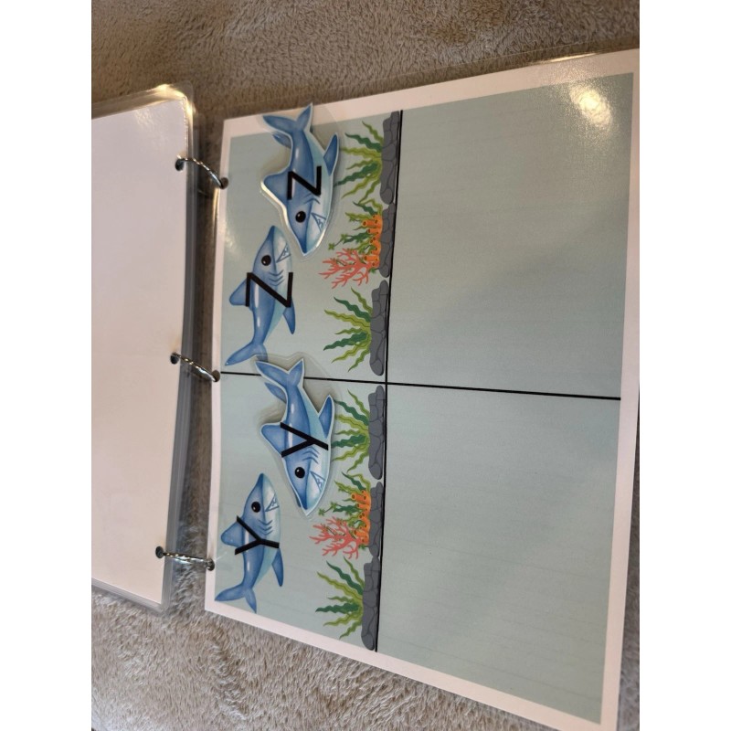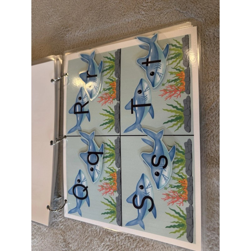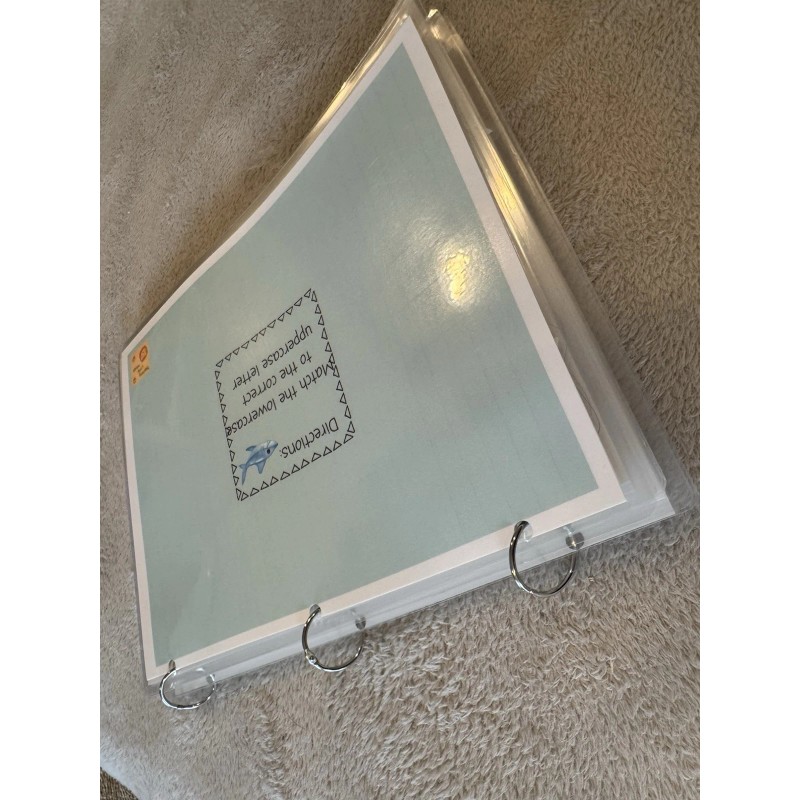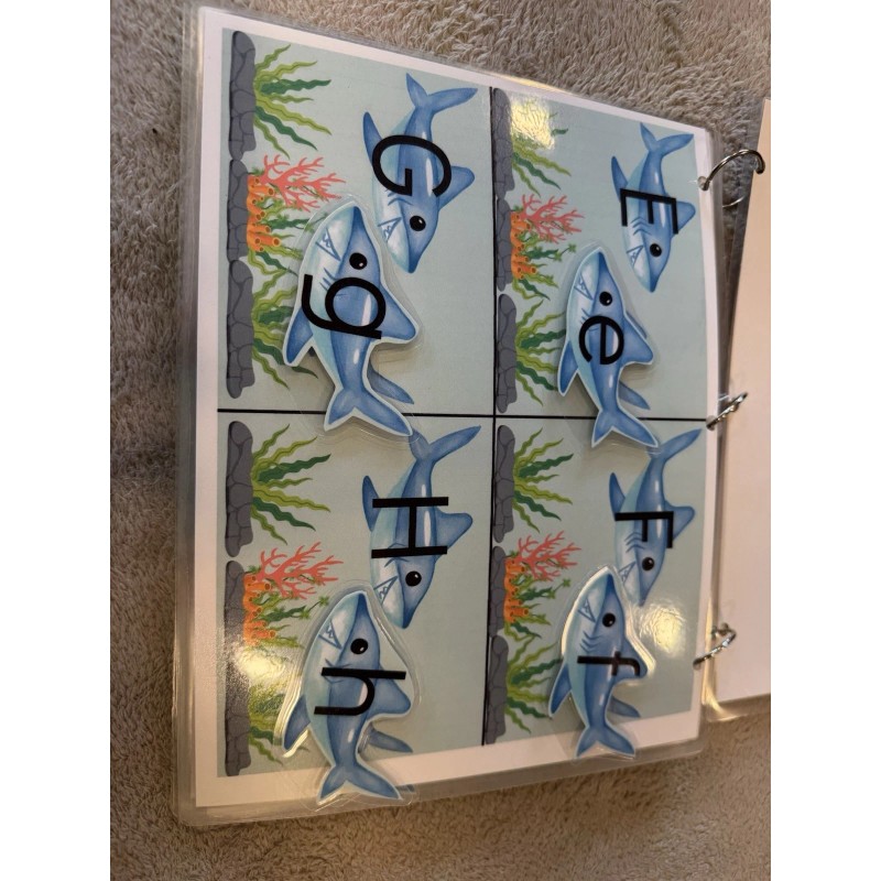 Matching lowercase letters to uppercase letters. All 26 letters in one activity busy book. Each page card stock 8 1/2 x 11 size plus laminated. The book is held together by 3 ring binders and can easily be taken apart and put back together. The letters stick with Velcro on both sides. There is also a pouch on the back to hold all the pieces. Great practice for learning the alphabet.