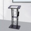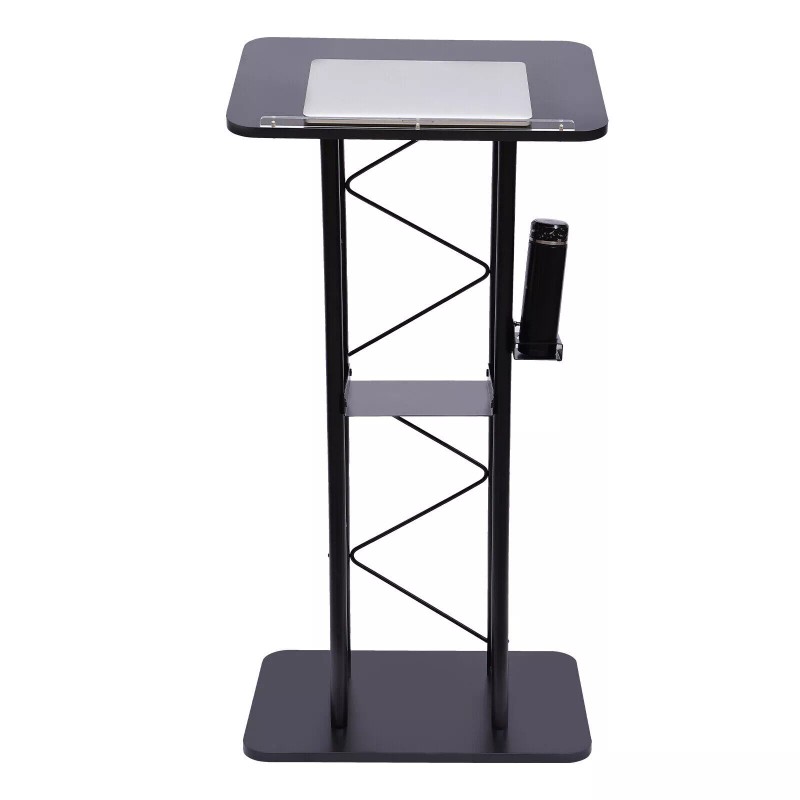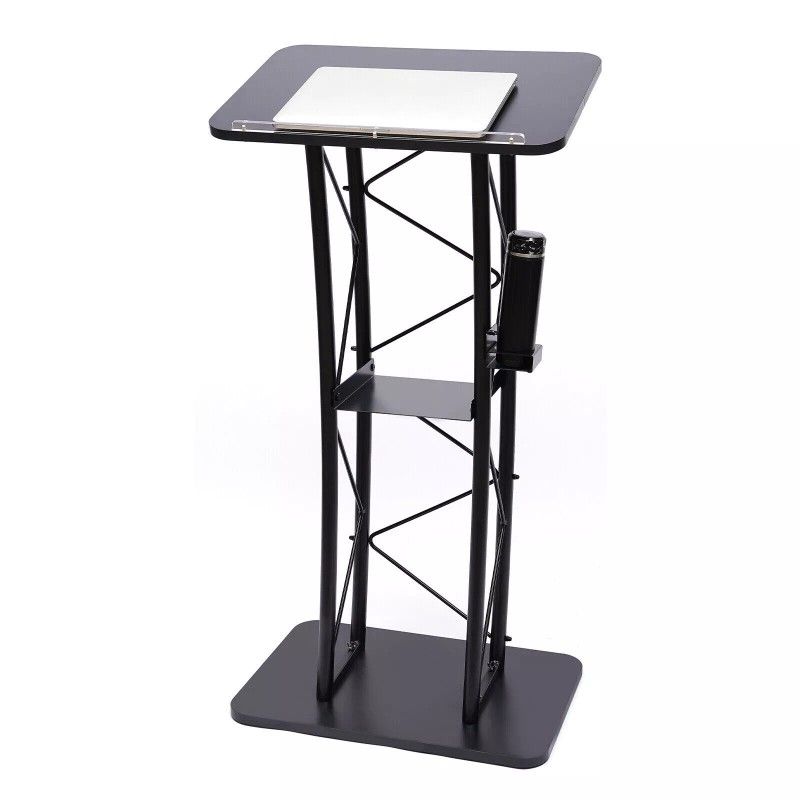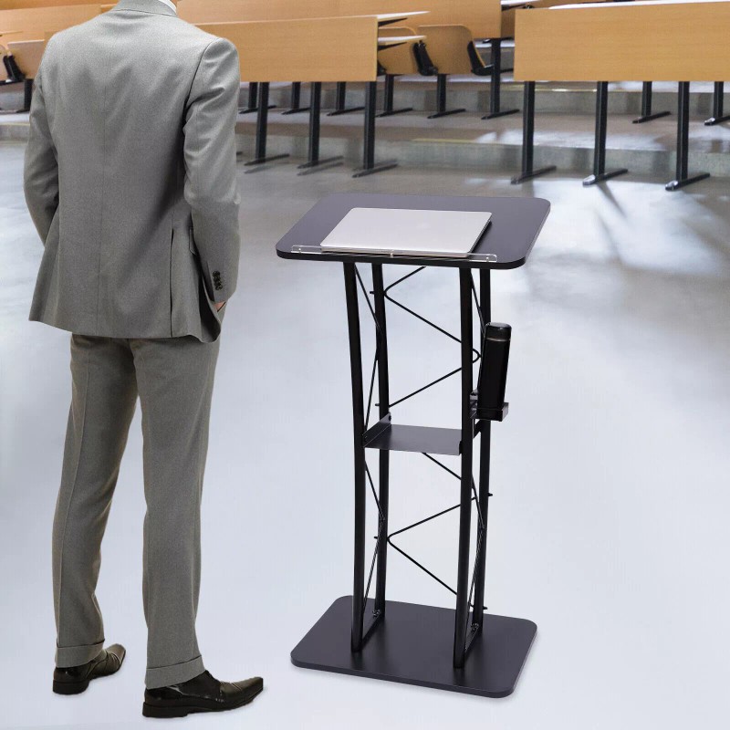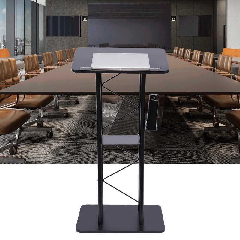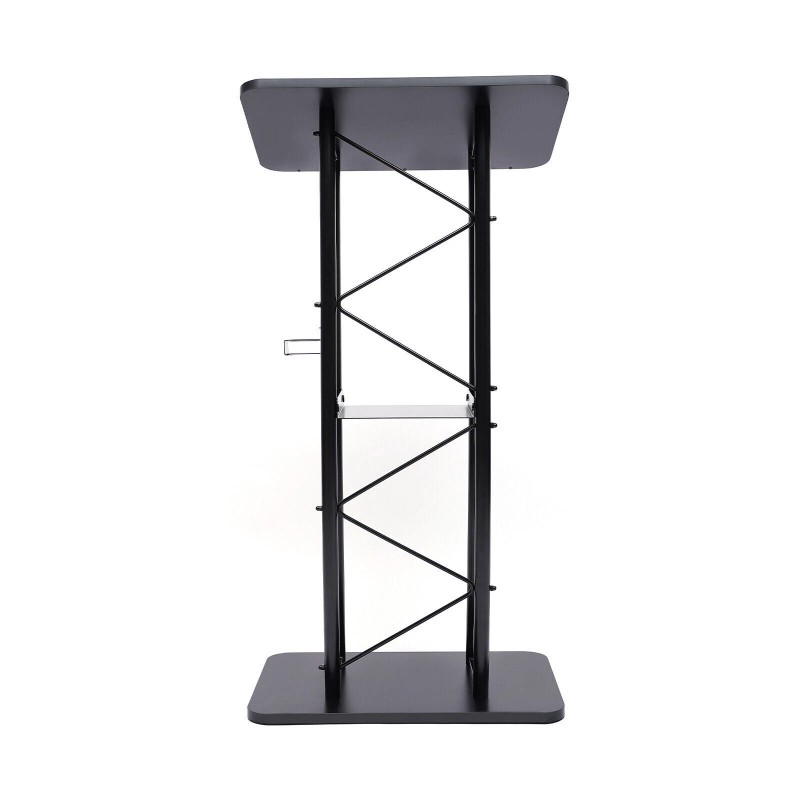 Cup Holder Design:There is a small cup holder design on the side of the stand to place your cup. This not only saves space but also eliminates the risk of the cups slipping off easily when placed on the tabletop. | Baffle Design:The surface of the upper board has a baffle design, which can facilitate you to place some speeches, materials and books, etc., without easily slipping off. | High Stability(Antiskid design):Its stand is made of high-quality iron, so it is very stable. Besides, the equal size of the upper and lower plates design makes the whole podium more stable. |