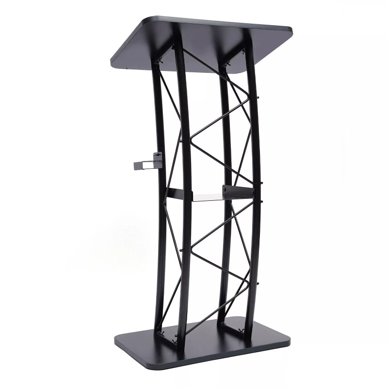 The stand of this curved podium is made of high-quality iron, so it is very stable. The black color scheme and the curved design make this podium simple and stylish at the same time. It has a sturdy but very modern construction. It is ideal for schools, conferences, events, churches, and classrooms.