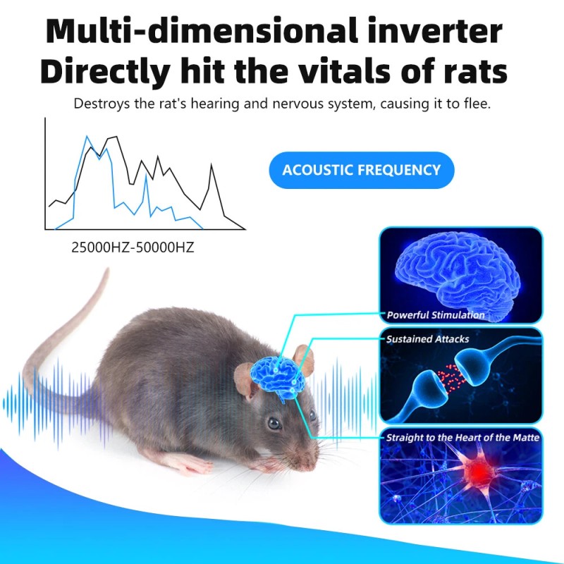 - 【How It Works】Ultrasonic pest control using the latest tri-frequency inverter technology, ultrasonic waves, pressure waves and electromagnetic wave frequency conversion coexist, which can effectively affect the nervous hearing system, so that pests and rats can't develop immunity to repellents. The newly added bionic wave imitates the sound of predators, scaring away rats and various pests.