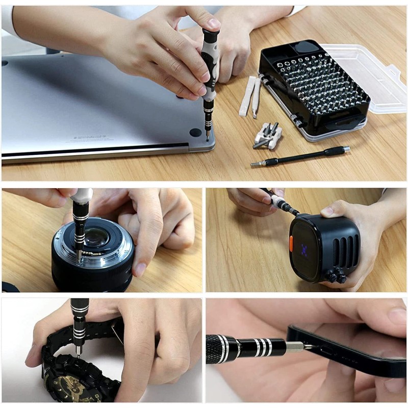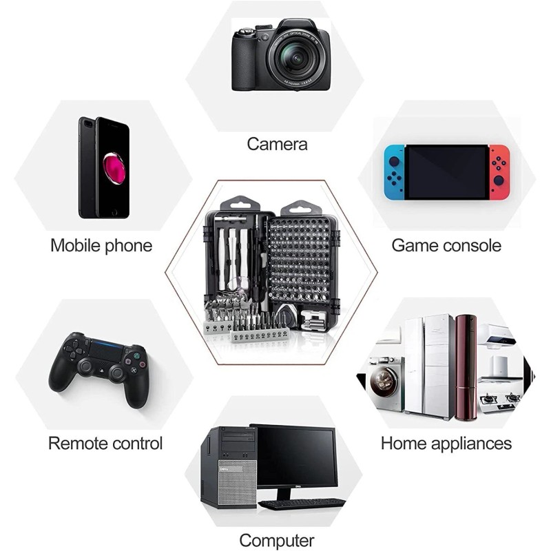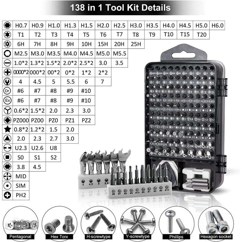The screwdriver set has 138 sets,117 precision screwdriver bits, including 10 Damaged Screw Extractor Set,6 mini wrenches,and 21 practical accessories in the repair box.For example, suction cups, magnetizers,magnetic pads,ESD tweezers,crowbars, memory mat, etc.Whether you are a professional or an amateur,you can use this electronic equipment repair kit to meet all your needs.This repair kit is suitable for repairing iphone,computers,PCs,tablets,Xbox,PS4,Nintendo,watches,glasses, cameras etc.