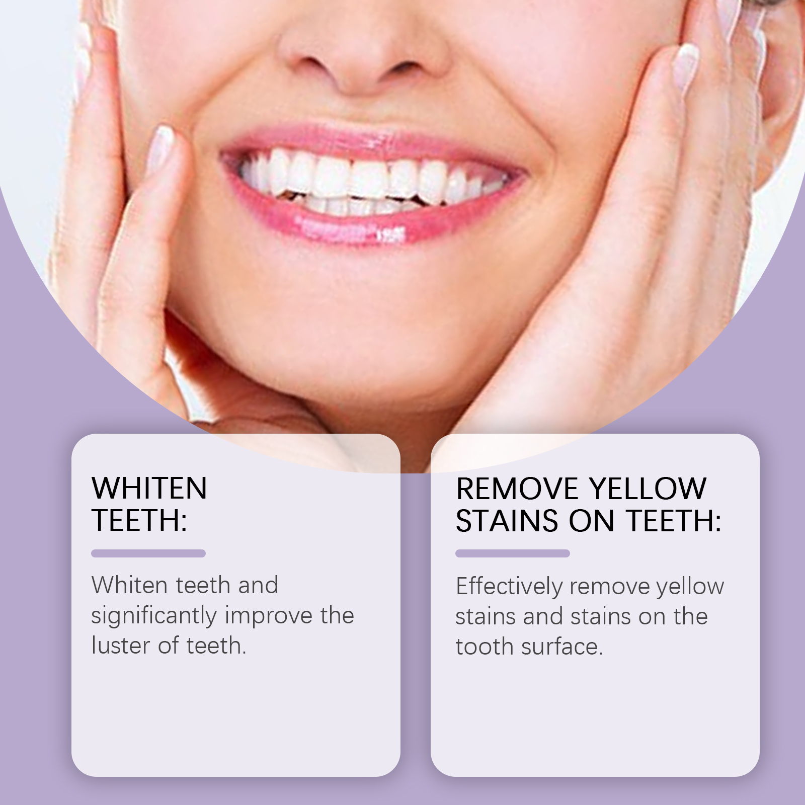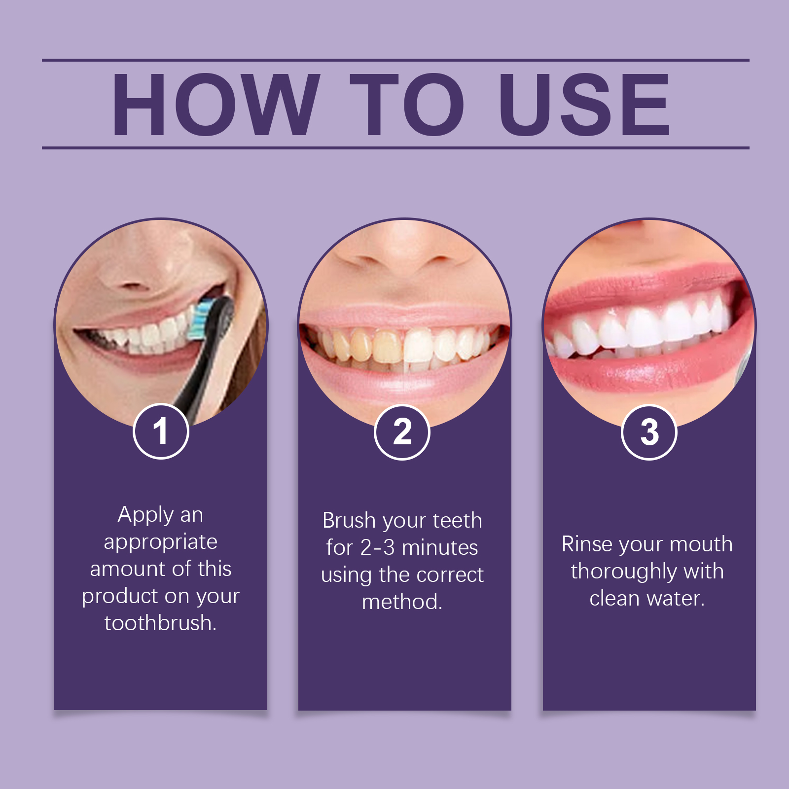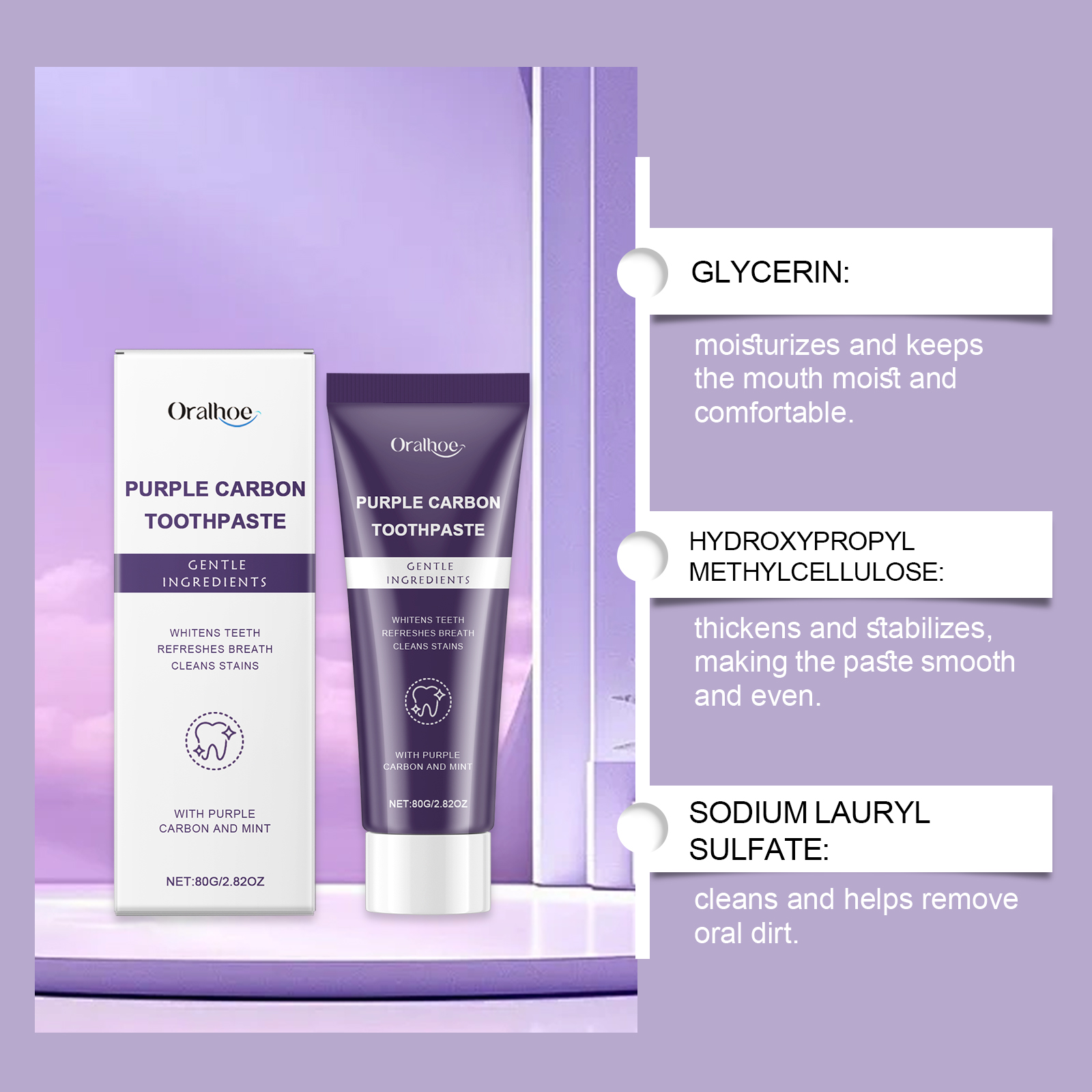 Our purple care toothpaste contains deionized water and glycerin. It can whiten teeth and significantly improve the shine of teeth. Effective removal of yellow stains and stains on the surface of teeth. The way to use it is simple: apply an appropriate amount of this product to a toothbrush. Brush your teeth properly for 2-3 minutes and rinse your mouth thoroughly with water. And can effectively remove yellow stains and stains on the surface of the teeth.
