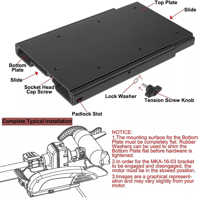• For quick, easy removal of your electric-steer, bow-mount trolling motor. Extruded aluminum design with side screw provides quiet and secure locking system