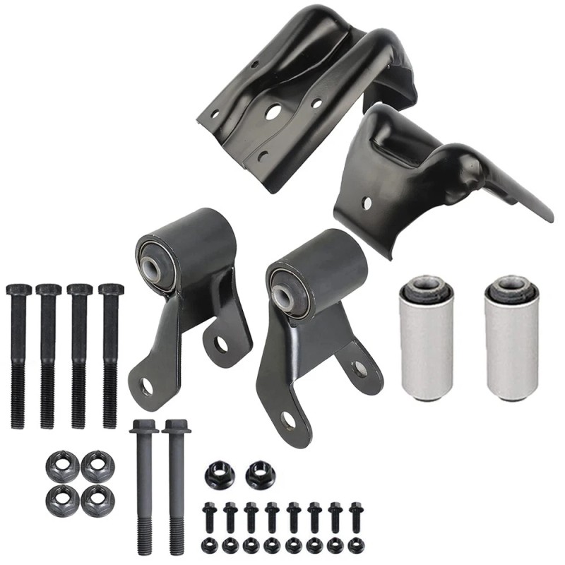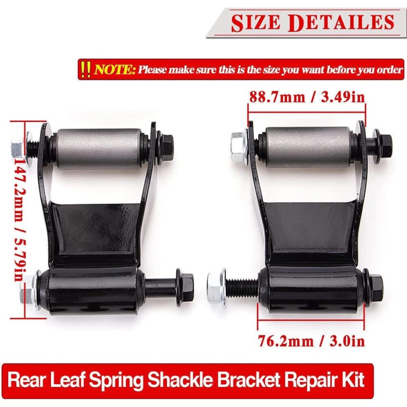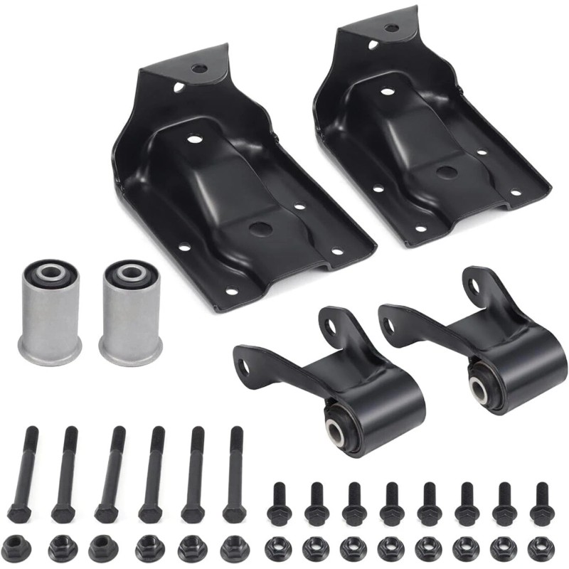- Easy Installation: Kit includes 2x Shackle with bushing, 2x Leaf spring hanger brackets, Spring bushing, Mounting bolts, and Locking nuts. All components are included for a hassle-free installation.