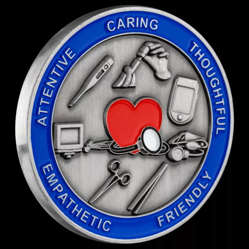 The front of this magnificent coin features a antique silver 3d caduceus, a symbol used for medicine and healing in the United States, with the letters R and N either side with the words registered nurse at the bottom. The back of the coin features core values of the nursing profession around the outside of the coin caring, thoughtful, friendly, empathetic, attentive. The middle features a stethoscope wrapped around a heart and some of the other devices that nurses use to help with our care and diagnosis.