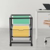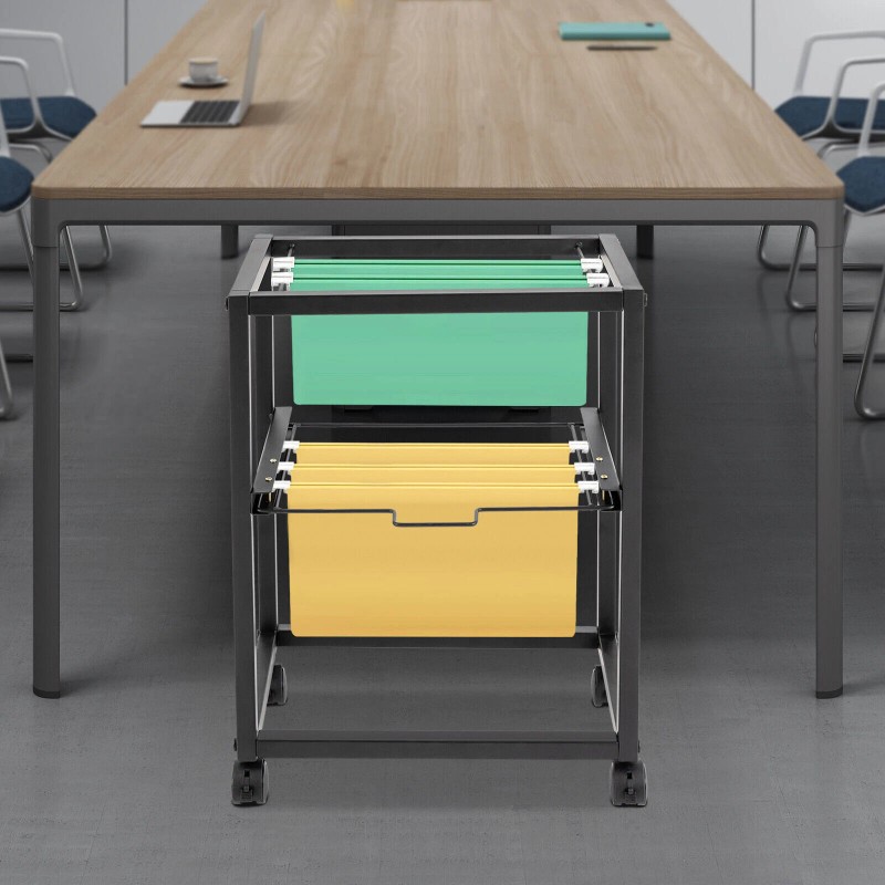 Upgrade your office with this rolling file cart! The two-tier storage space and pull-out drawer design provide sufficient storage options. The semi-open design makes it easy to access paper and accessories. The built-in wheels allow you to easily move it to where you want to go. It is an ideal complement for many offices.