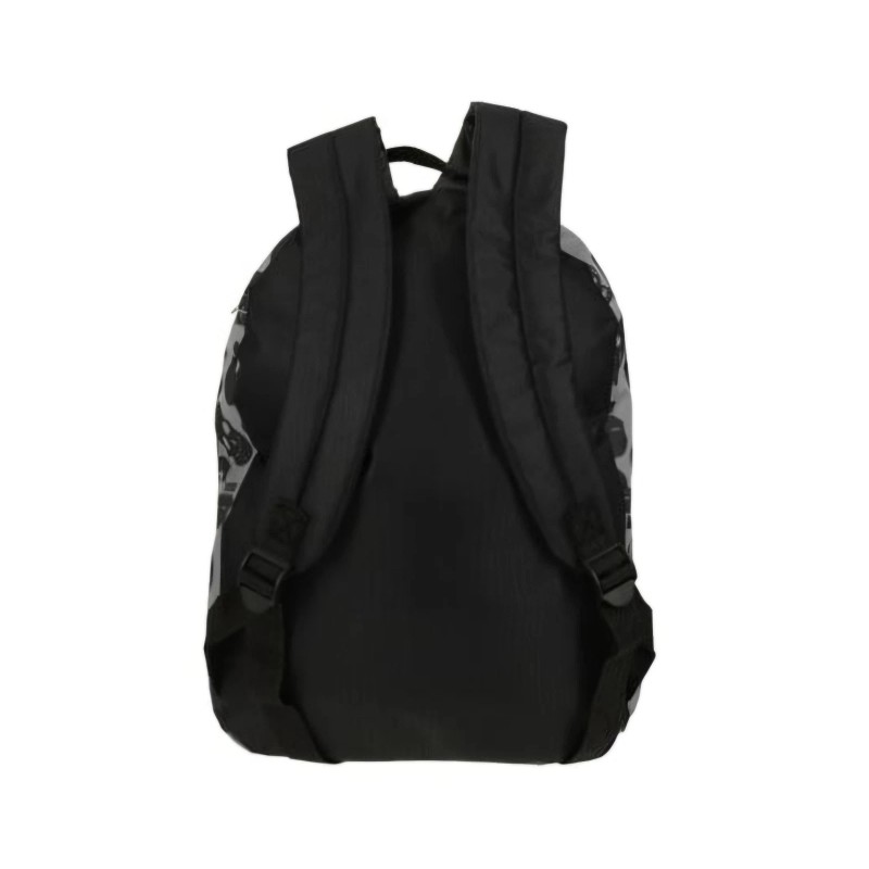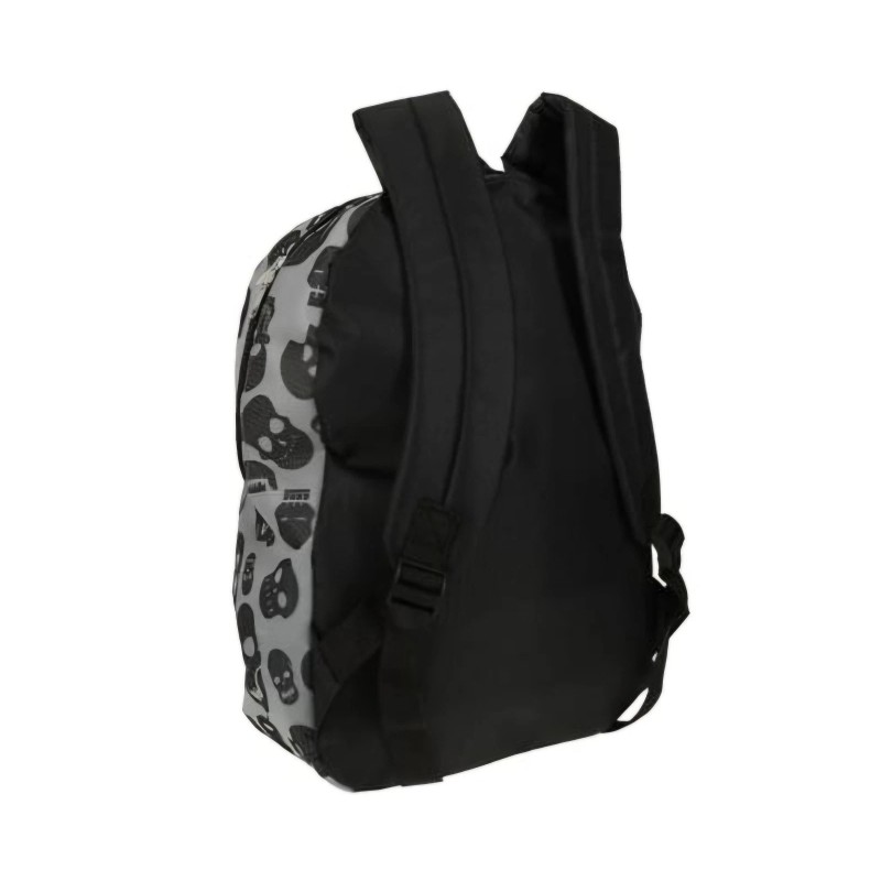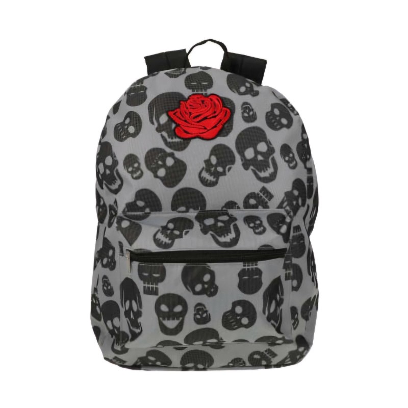 Features black skulls on gray with red rose icon patch, front zip pocket, adjustable straps, hanging loop